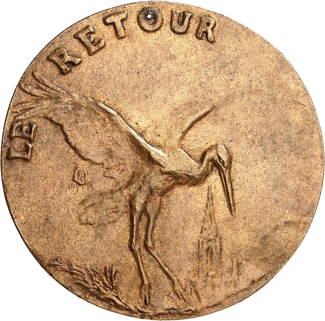 Av. LE RETOUR. Sur une branche de laurier, une cigogne éployée avec la cathédrale de Strasbourg en fond ; signature PR en monogramme [Et d’un vol désormais libre, l’oiseau d’Alsace peut survoler la cathédrale de Strasbourg pour retrouver son nid].