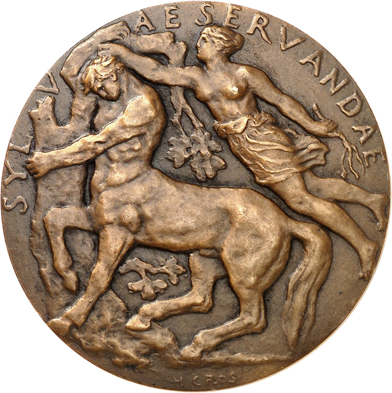 Rv. SYLVAE SERVANDAE (Protection des forêts). Un centaure à gauche en train d’arracher un arbre, tandis qu’une dryade (nymphe des arbres) lui tire les cheveux pour le punir ; signature H. CROS.