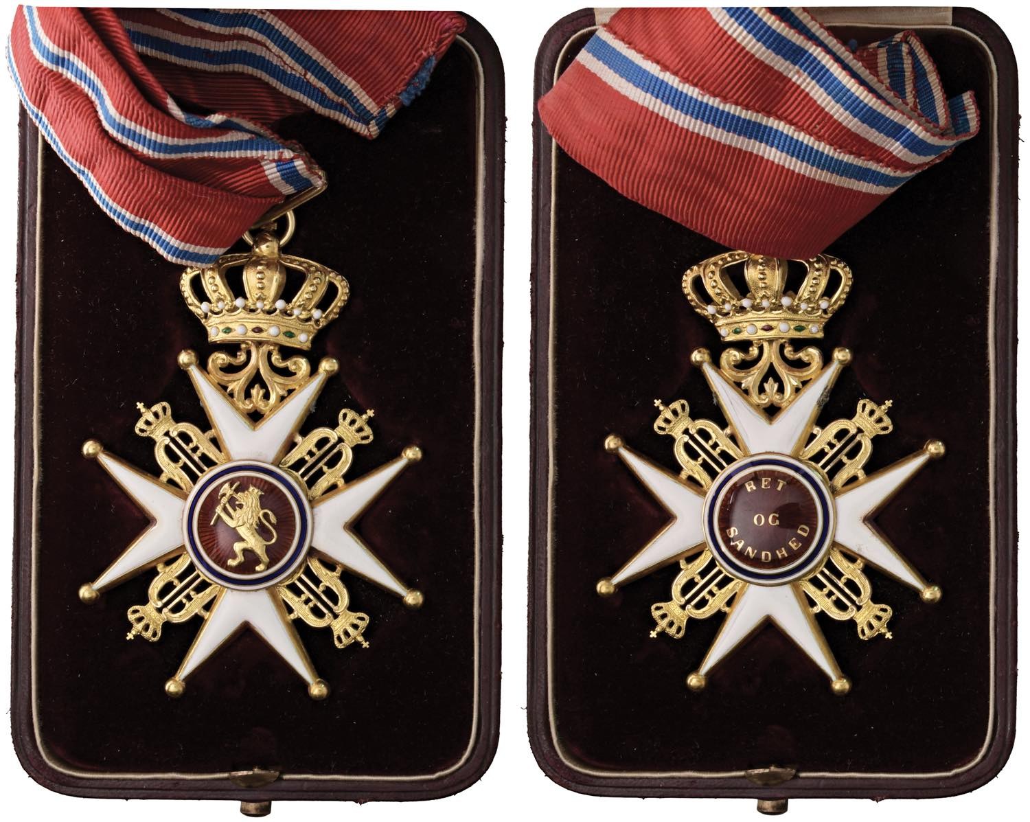 Norvegia. Decorazione (1872-1907) Gran Croce Militare in Oro e smalti dell'Ordine di Sant Olaf, emissione voluta dal Re Oscar II - RRR - AU e smalti (g 38,51 - Ø 85x60 mm) Rarissima decorazione in ottimo stato di conservazione. Corredata del suo cofanetto di emissione della ditta J. Tostrup, con vano alzabile contenente 2° nastrino a fascia larga