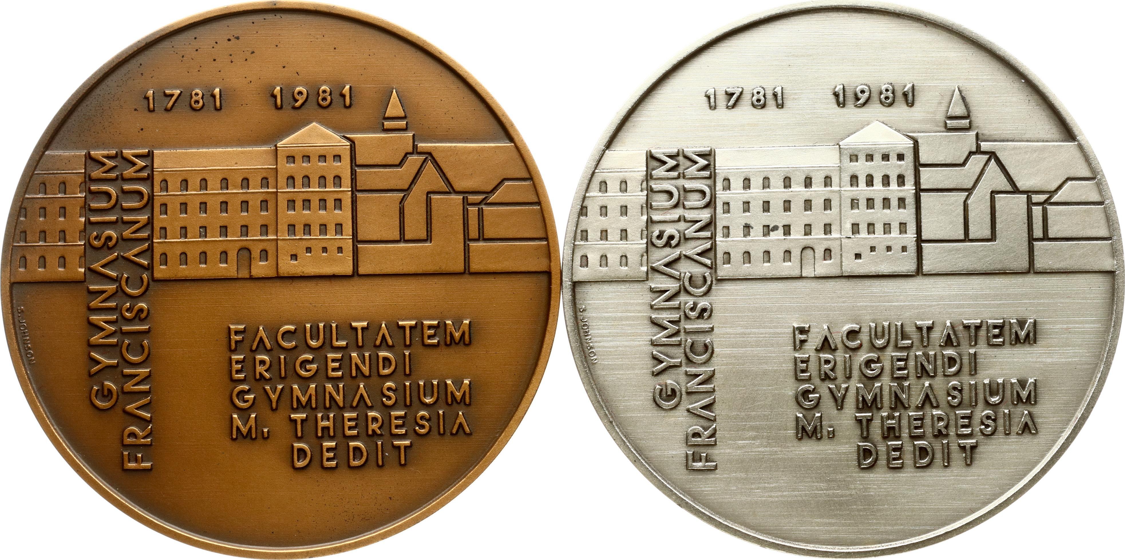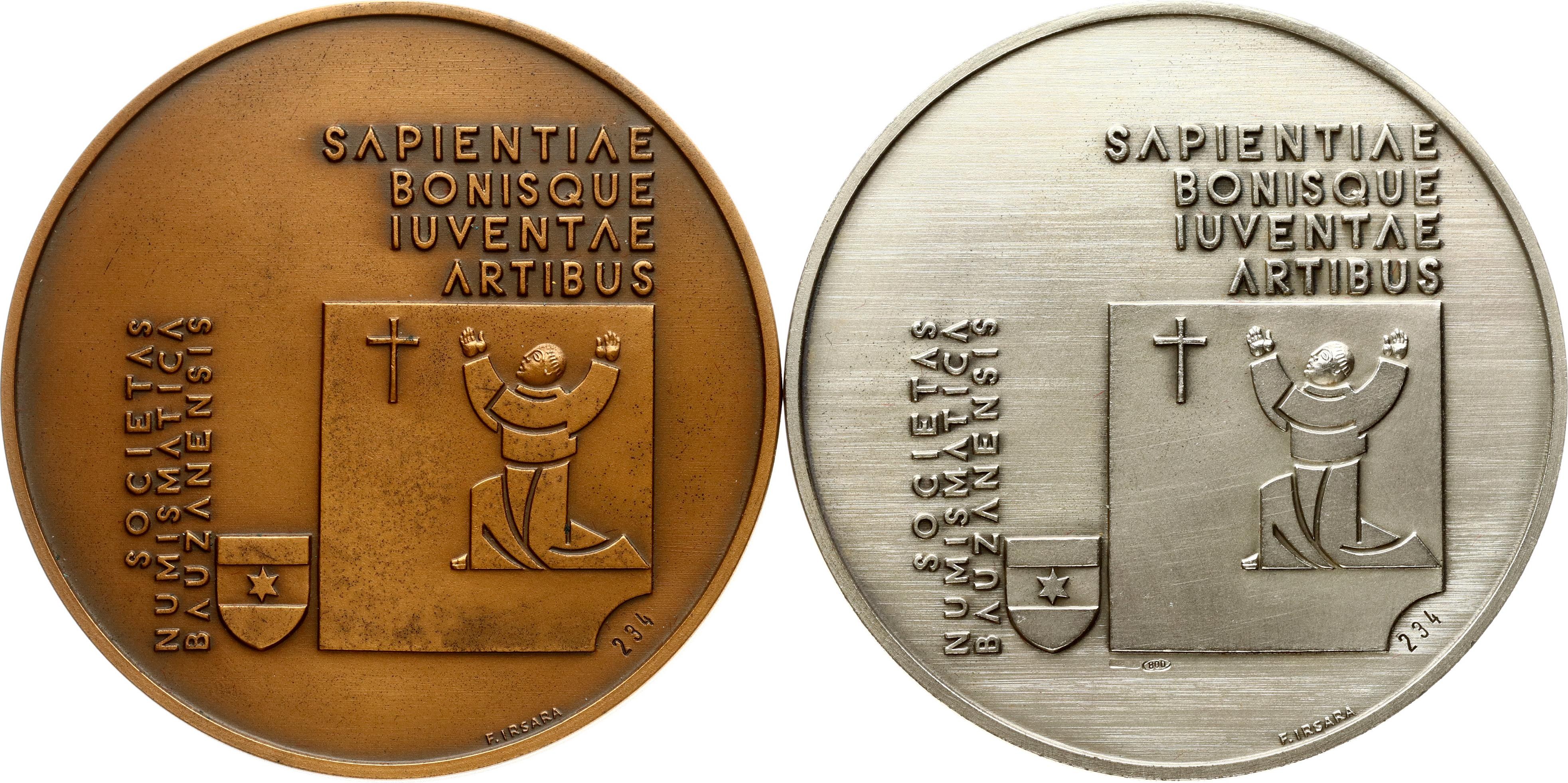 Italy Medal Bolzano Anniversary of the Franciscan School 1981 Set. Obverse: top: 1781 1981 View of building on the left, vertical: GYMNASIUM FRANCESCANUM, below: FACULTATEM ERIGENDI GYMNASIUM M. THERESIA DEDIT. Reverse: top right: SAPIENTIAE BONISQUE IVENTAE ARTIBUS within box: Friar kneeling to the left, praying the Crucifix. right: shield with central star between two horizontal n vertical backgrounds left: SOCIETAS NUMISMATIQUE BAUZANENSIS. ? 234. Bronze 66 mm., 103.14 g., Silver .800, 120.63 g. With Box. Lot of 2 pcs