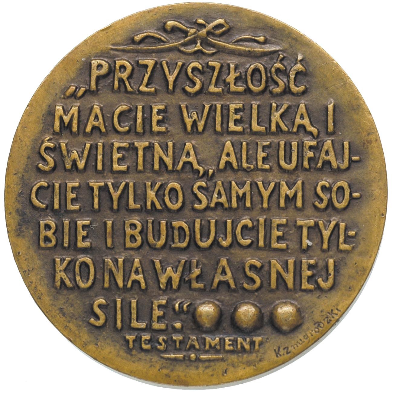 POLSKA, Jan Henryk Dąbrowski- medal autorstwa K. Żmigrodzkiego wybity z okazji 100-rocznicy śmierci 1918 r., Aw: Popiersie generała trzyczwarte w lewo i napis w otoku, Rw: Napis poziomy PRZYSZŁOŚĆ MACIE WIELKĄ I ŚWIETNĄ ALE UFAJCIE TYLKO SAMYM SOBIE I BUDUJCIE TYLKO NA WŁASNEJ SILE TESTAMENT, brąz 40 mm, Strzałkowski 432 R, wybito 100 egzemplarzy, rzadki