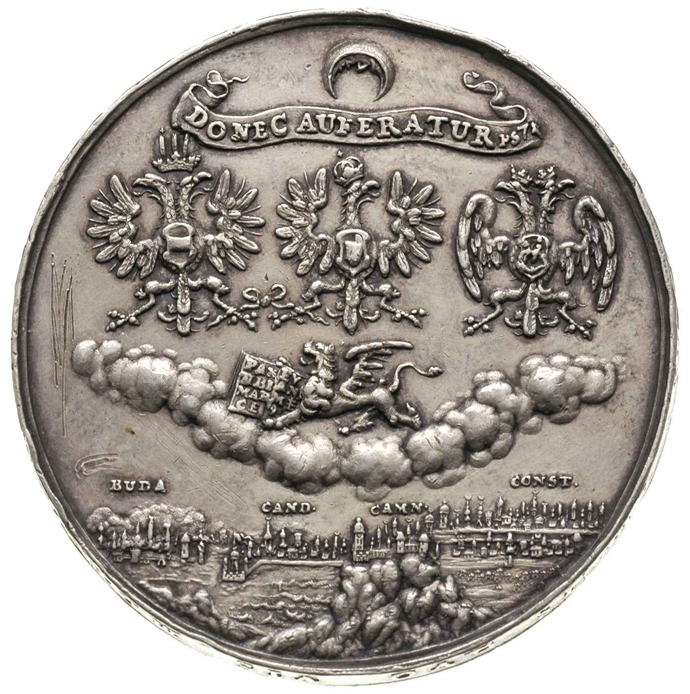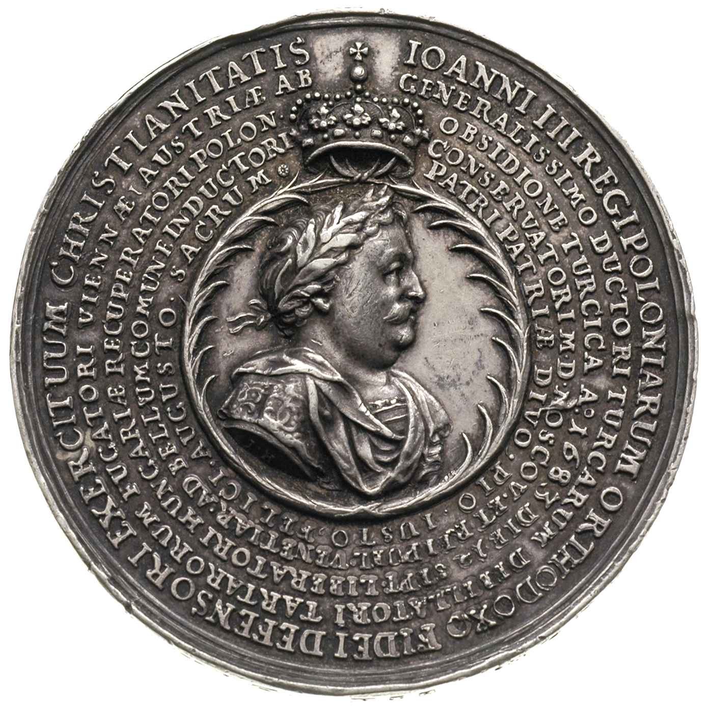 POLSKA, Jan III Sobieski, -medal autorstwa Jana Höhna jun. wybity z okazji utworzenia przez Polskę, Austrię, Rosję i Wenecję, koalicji antytureckiej w 1684 r., Aw: Popiersie króla w zbroi antycznej w prawo i napis w pięciu otokach, Rw: Po bokach polskiego orła z herbem Sobieskich na piersi orzeł rosyjski i austriacki, niżej Lew wenecki, na szarfie u góry napis DONEC AUFERATUR PS 71, u dołu widoki Budy, Krety, Kamieńca Podolskiego oraz Konstantynopola, napis na rancie INGENTIBUS AUSIS..., srebro 68.95 g, 56.5 mm, H-Cz. 2480 (R4), Racz. 220, piękne wykonanie, patyna, rzadki