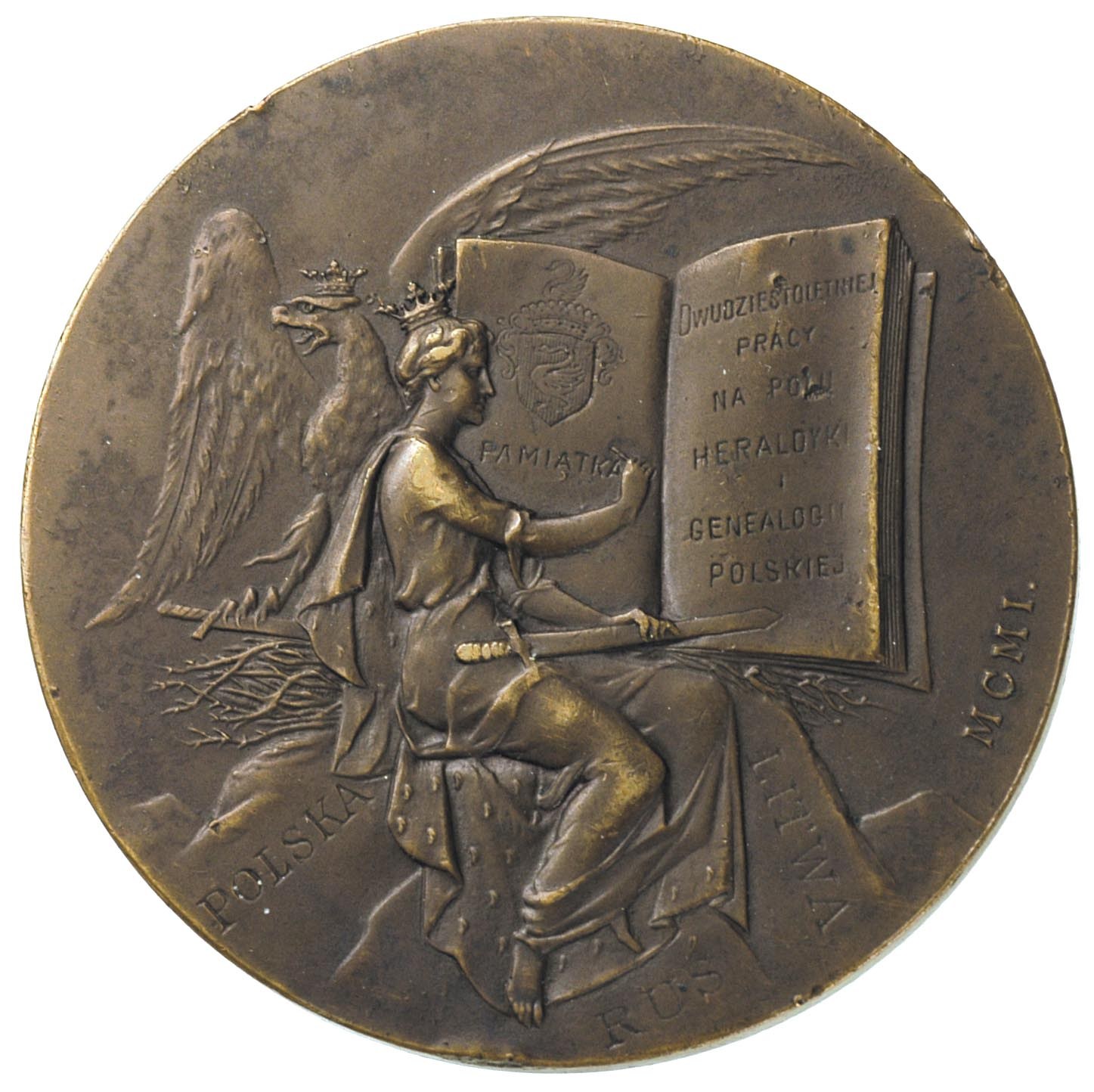 POLSKA, Jerzy Dunin-Borkowski- medal autorstwa Schwerdtnera 1901 r., Aw: Popiersie w lewo i napis w otoku, Rw: Kobieta w koronie na głowie i z mieczem pisząca w otwartej ksiedze PAMIĄTKA DWUDZIESTOLETNIEJ PRACY NA POLU HERALDYKI I GENEALOGII POLSKIEJ data MCMI, brąz 73.09 g, 58 mm, Strzałkowski 14