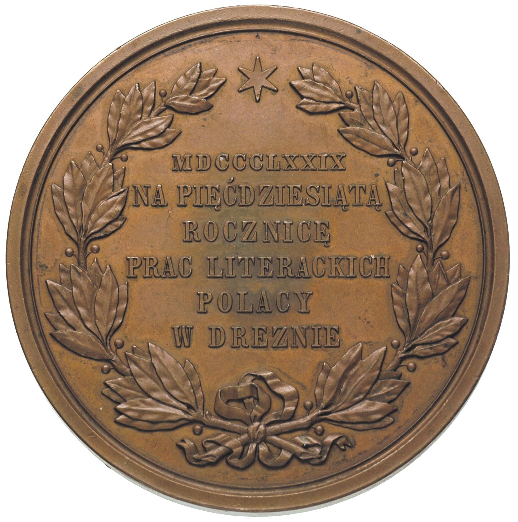 POLSKA, Józef Ignacy Kraszewski - medal autorswa M. Bardulecka wybity w 1879 r., Aw: Głowa pisarza w prawo i napis dookoła, u dołu sygnatura, Rw: W Wieńcu laurowym poziomy napis; MDCCLXXXIX NA PIĘĆDZIESIĄTĄ ROCZNICĘ PRAC LITERACKICH POLACY W DREŹNIE, brąz 64.86 g, 52 mm, H-Cz. 10470