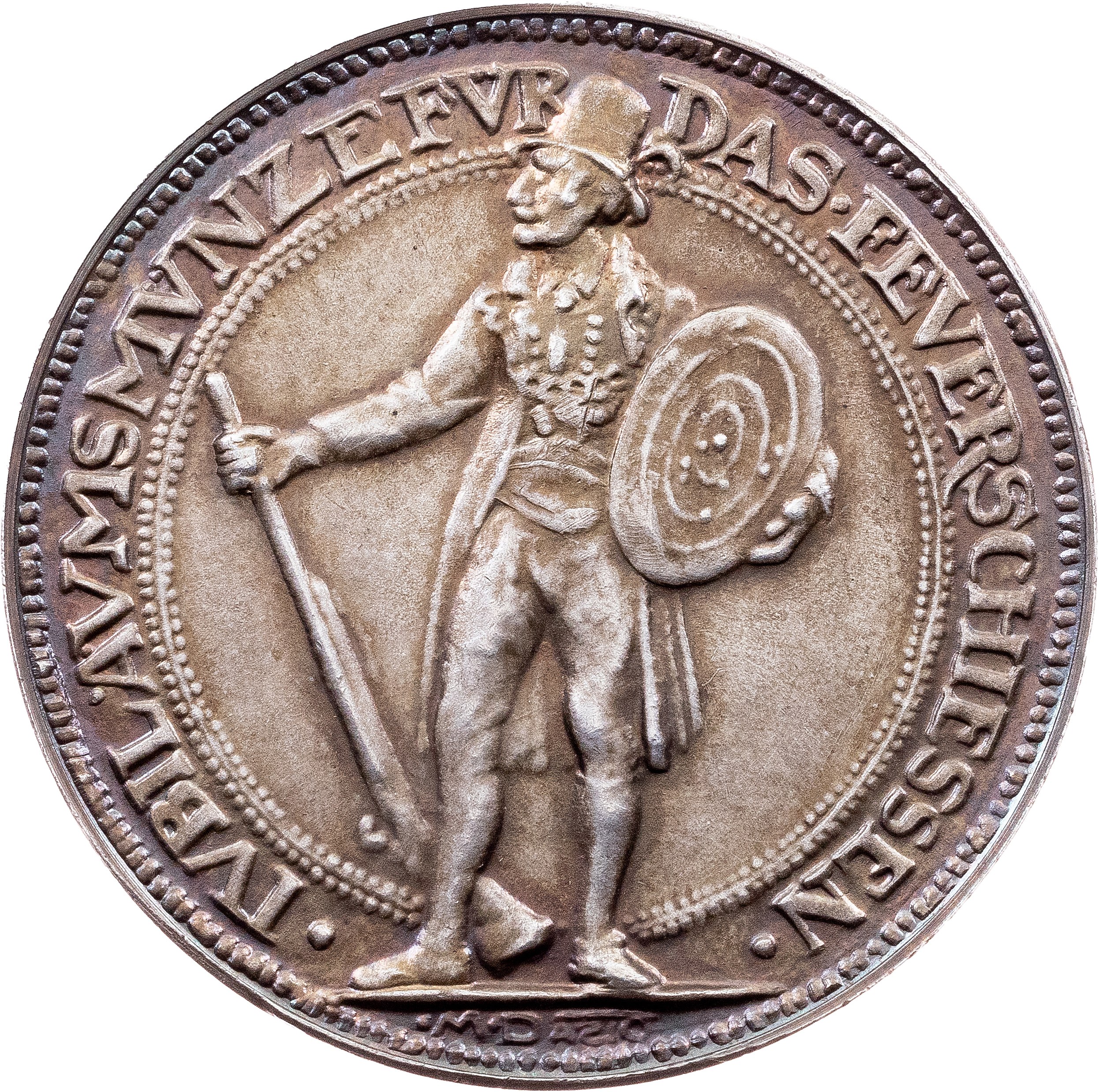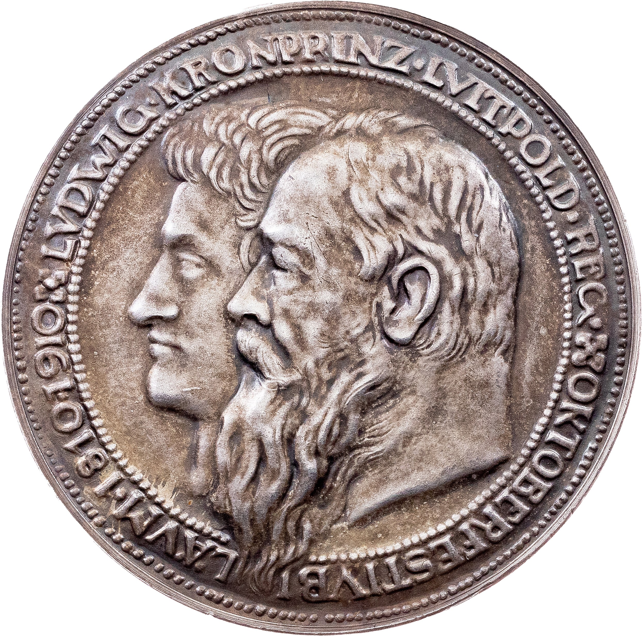 Description: By M. Dasio, 100th Anniversary of the Munich Oktoberfest. Obv: Double portrait of Prince Regent Luitpold and King Ludwig I as crown princes facing left / Rev: Standing shooter