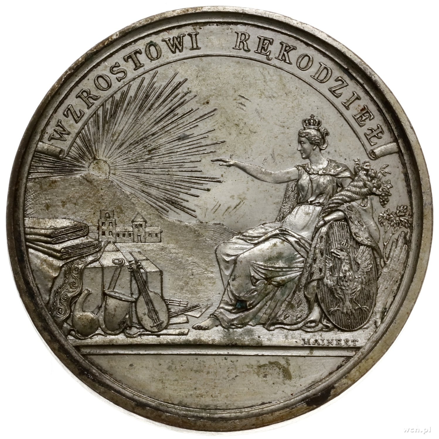 Królestwo Polskie, Aleksander I 1815-1825, kopia galwaniczna medalu Wzrostowi Rękodzieł z 1821; Aw: Popiersie władcy w prawo, w wieńcu laurowym, w dolnej części sygnatura MAINERT, w otoku ALEXANDER I. CESARZ SA • W • ROS • KRÓL POLSKI; Rw: Siedząca kobieta w lewo, w lewej ręce, opartej na tarczy z Orłem, trzyma róg obfitości, prawą ręką wskazuje słońce, z lewej narzędzia i instrumenty, w tle budynek na zboczu i wschodzące słońce, na dole sygnatura MAINERT, u góry we wstędze WZROSTOWI RĘKODZIEŁ; H.-Cz. 3553 (oryginał); cynk srebrzony, 44.2 mm, 21.06 g; oryginalny medal projektu Majnerta, ładnie zachowana i wyraźna kopia, bez daty w odcinku