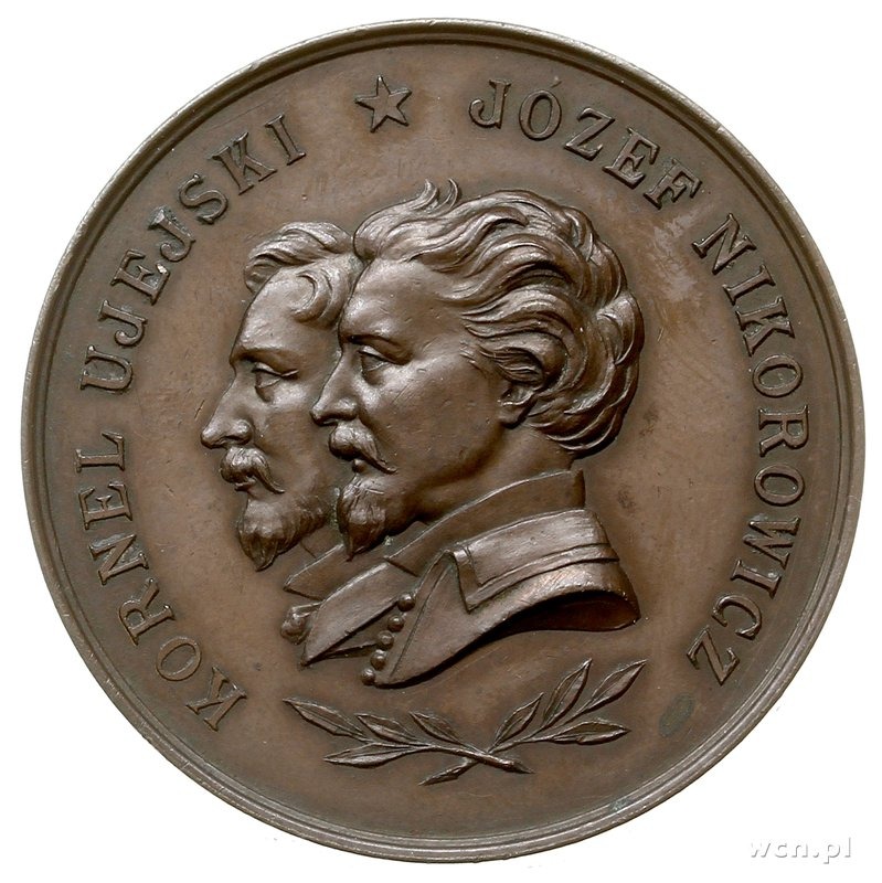 POLSKA, Kornel Ujejski i Józef Nikorowicz - medal wybity z okazji napisania chorału 1893 r., Aw: Popiersia w lewo, niżej dwie gałązki oliwne, napis wokoło KORNEL UJEJSKI JÓZEF NIKOROWICZ, Rw: W wieńcu cierniowym napis poziomy Z DYMEM POŻARÓW Z KURZEM KRWI BRATNIEJ DO CIEBIE PANIE BIJE TEN GŁOS / TWÓRCOM CHORAŁU KOŁO ART LITER. w KRAKOWIE 1893, brąz 45 mm, H-Cz. 10481, patyna