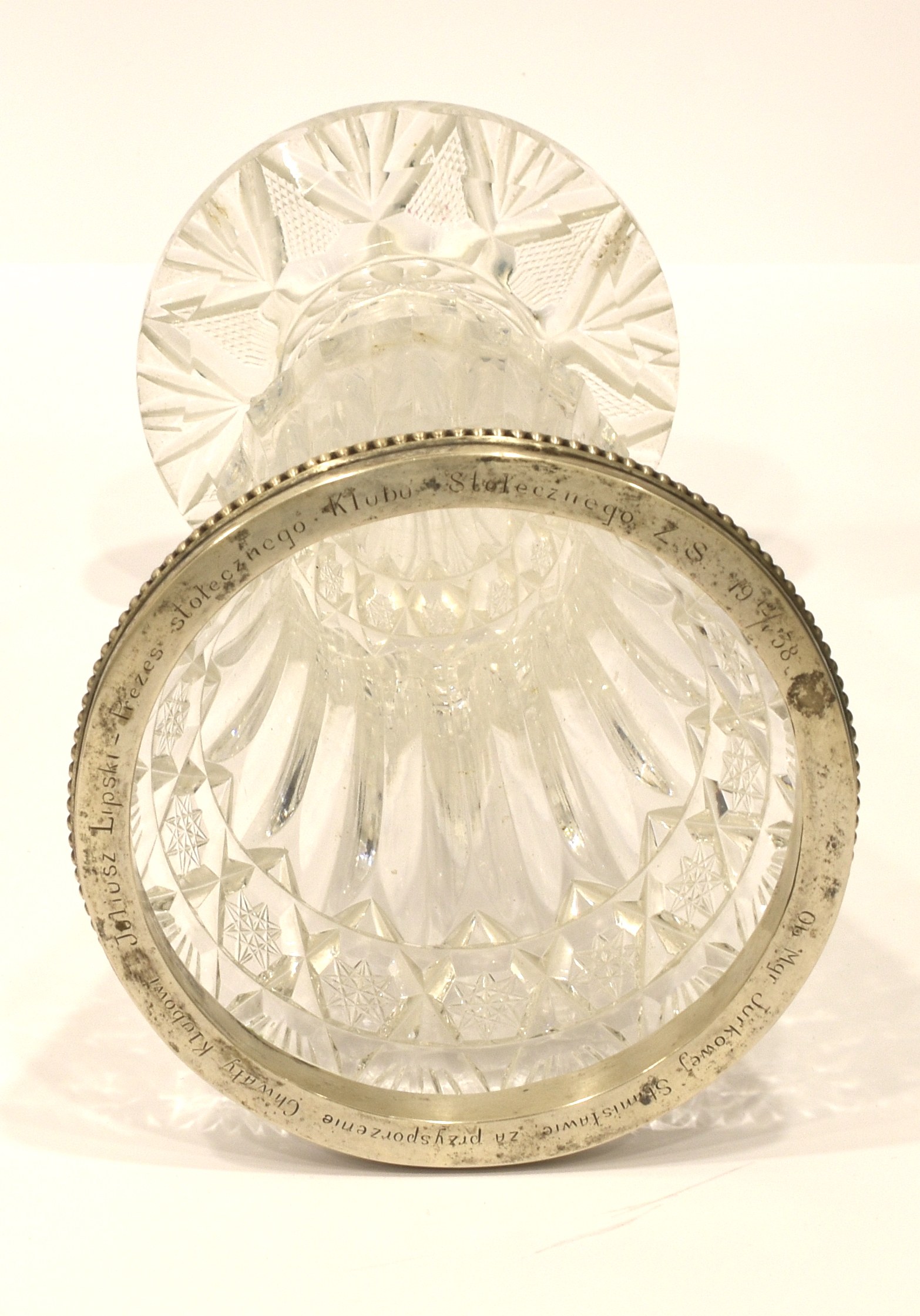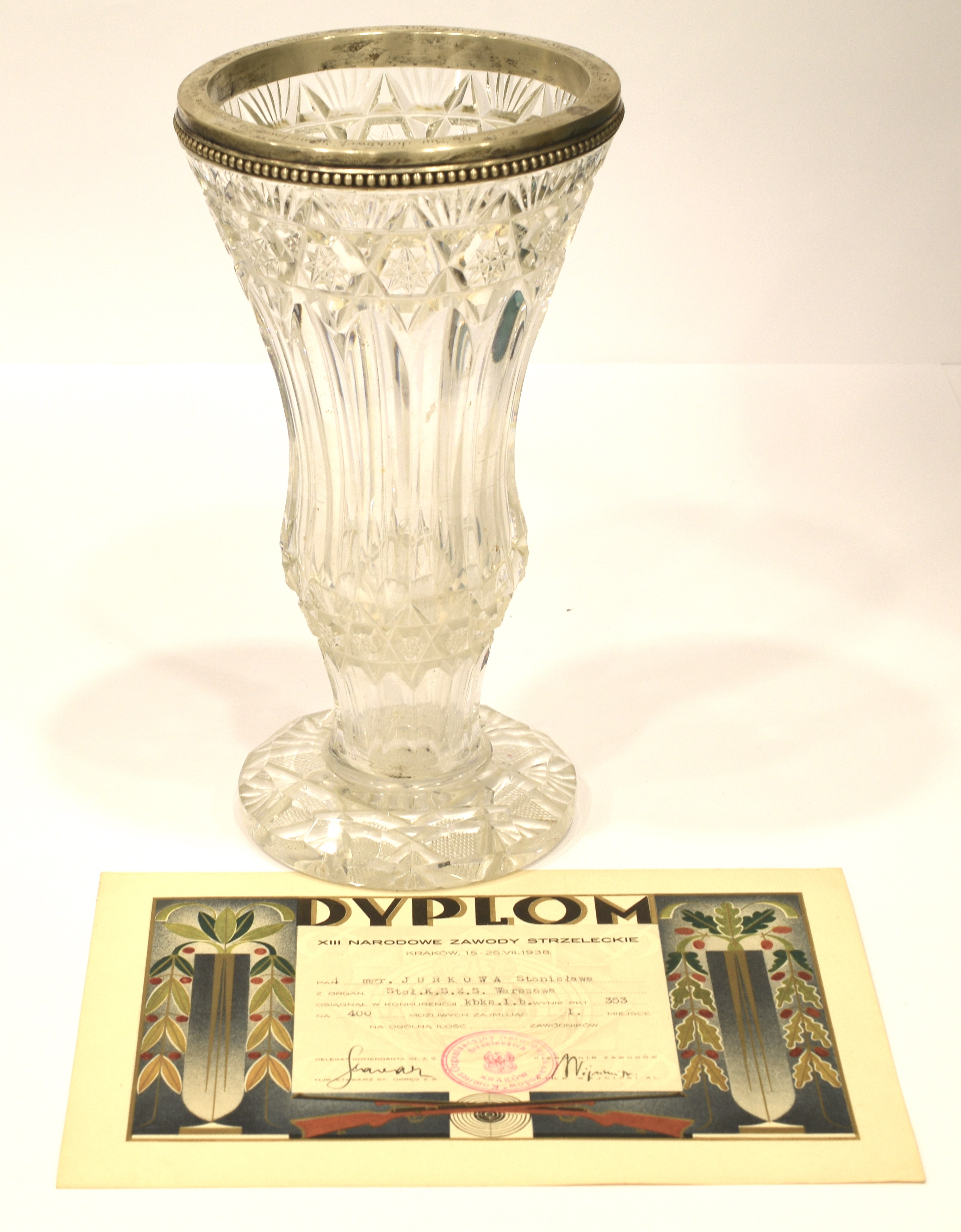 Kryształowy puchar z dedykacją umieszczoną na srebrnym zwieńczeniu dla zwyciężczyni III Narodowych Zawodów Strzeleckich Pani Stanisławy Jurkowej, które odbyły się w Krakowie w 1938 roku.