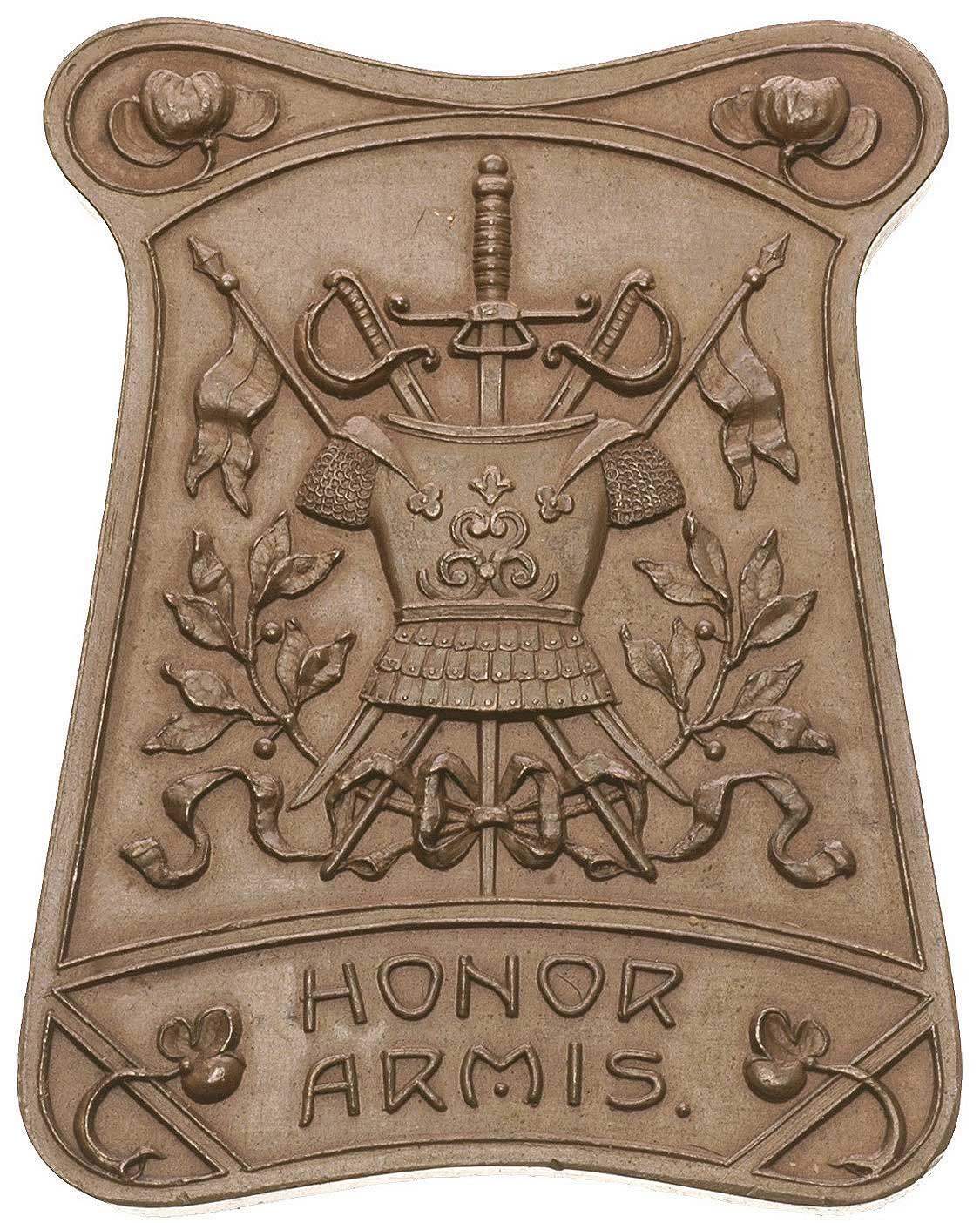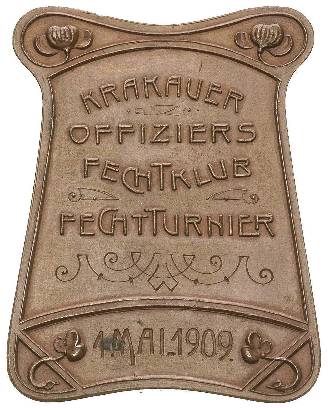 POLSKA, Krakowski Oficerski Klub Szermierczy- turniej szermierczy 1. maja 1909, Aw: Napis niemiecki i wygrawe- rowana data, Rw: Akcesoria szermiercze na tle gałązek oliwnych, i dołu napis HONOR ARMIS, brąz w kształcie wydłużonej tarczy z wklęsłymi bokami 57 x 45 mm, ładna patyna