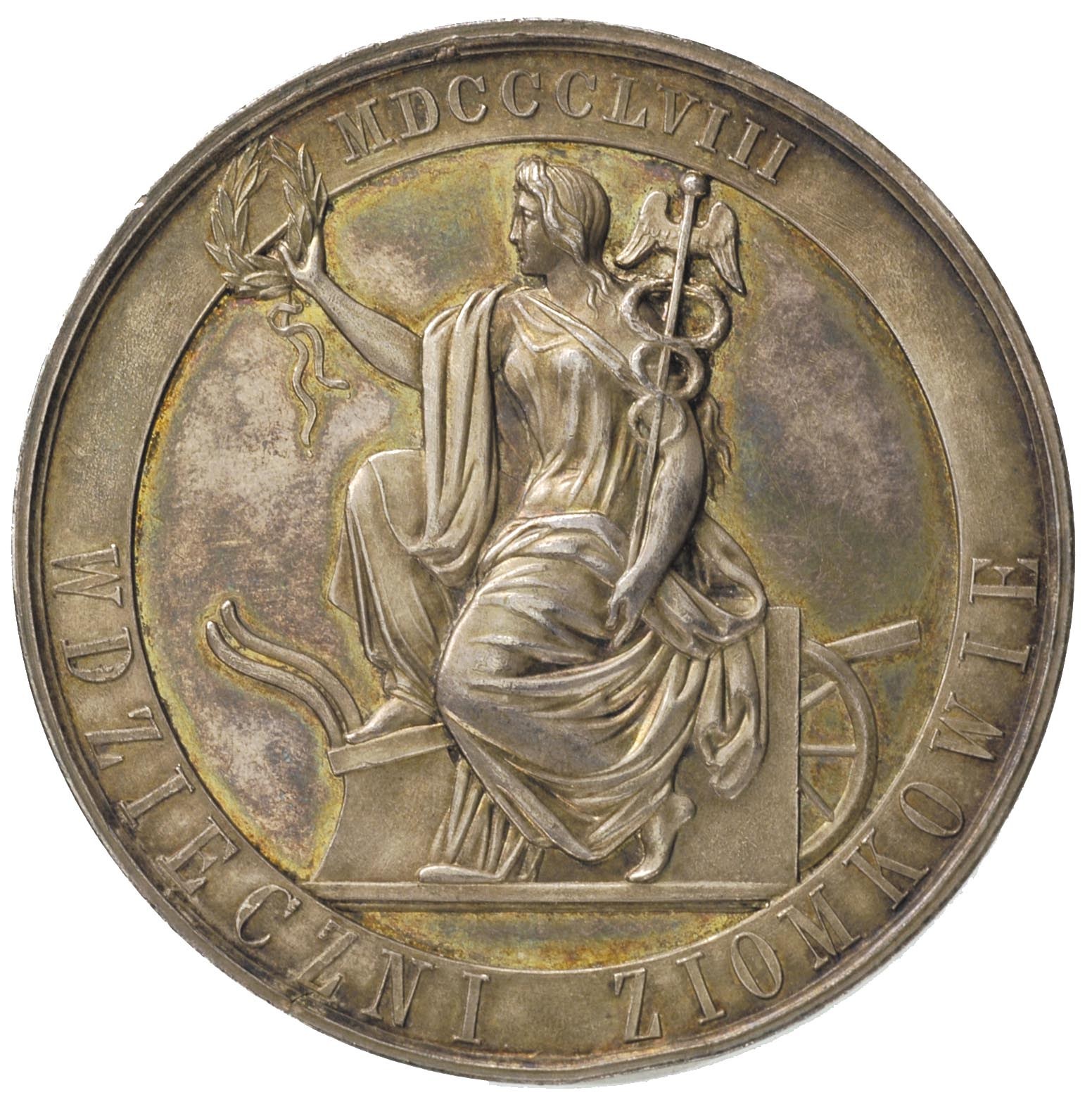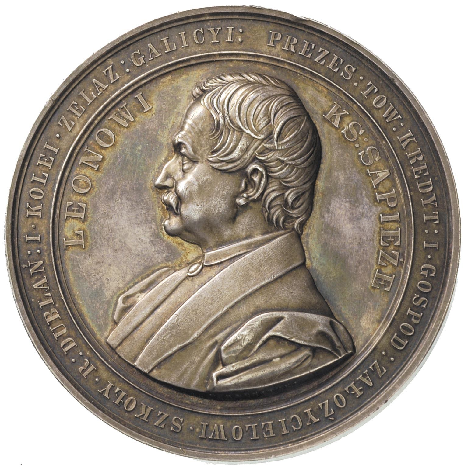 POLSKA, Leon Sapieha - medal autorstwa C. Radnitzkiego wybity 1858 r., Aw: Popiersie w lewo i napis w otoku wewnętrznym; LEONOWI SAPIEŻE, w otoku zewnetrznym; PREZES.TOW.KREDYT....., Rw: Siedząca kobieta z atrybutami przemysłu, handlu i rolnictwa, w otoku napis WDZIĘCZNI ZIOMKOWIE MDCCCLVIII, srebro 104.89 g, 61.6 mm, H-Cz. 4036, piękny egzemplarz w ładnym oryginalnym pudełku