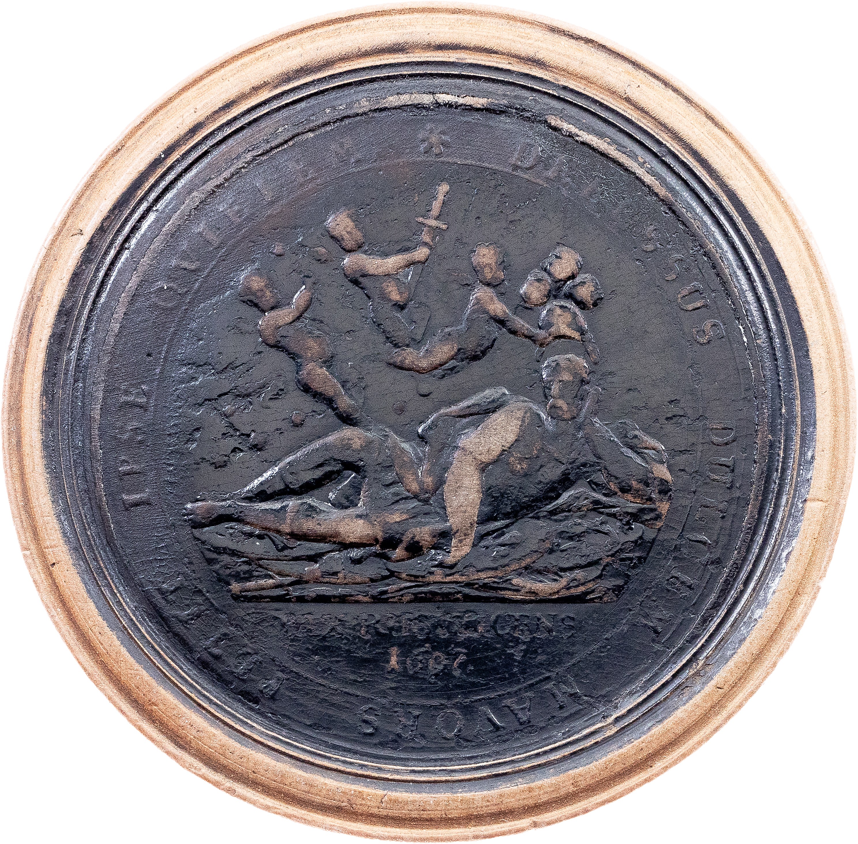 Description: By Brunner; "Peace of Rijswick"; Obv: Sleeping lion on a sheaf of wheat, rooster pecking at a sheaf of wheat, burning castles on the Rhine in the background, and the inscription "NE FIDAS SOMNO NON INCUBAT AGNUS ARISTIS" above / Rev: Three cherubs above a sleeping warrior, the inscription in two lines in exergue "PAX RESVRGENS 1697", and the circular inscription "DEFESSUS DULCEM MAVORS PETIT IPSE QVIELEM"; The Peace of Ryswick (Rijswijk), were a series of treaties signed in the Dutch city of Rijswijk between 20 September and 30 October 1697. They ended the 1688 to 1697 Nine Years' War between France and the Grand Alliance, which included the Dutch Republic and the Holy Roman Empire; Very rare!