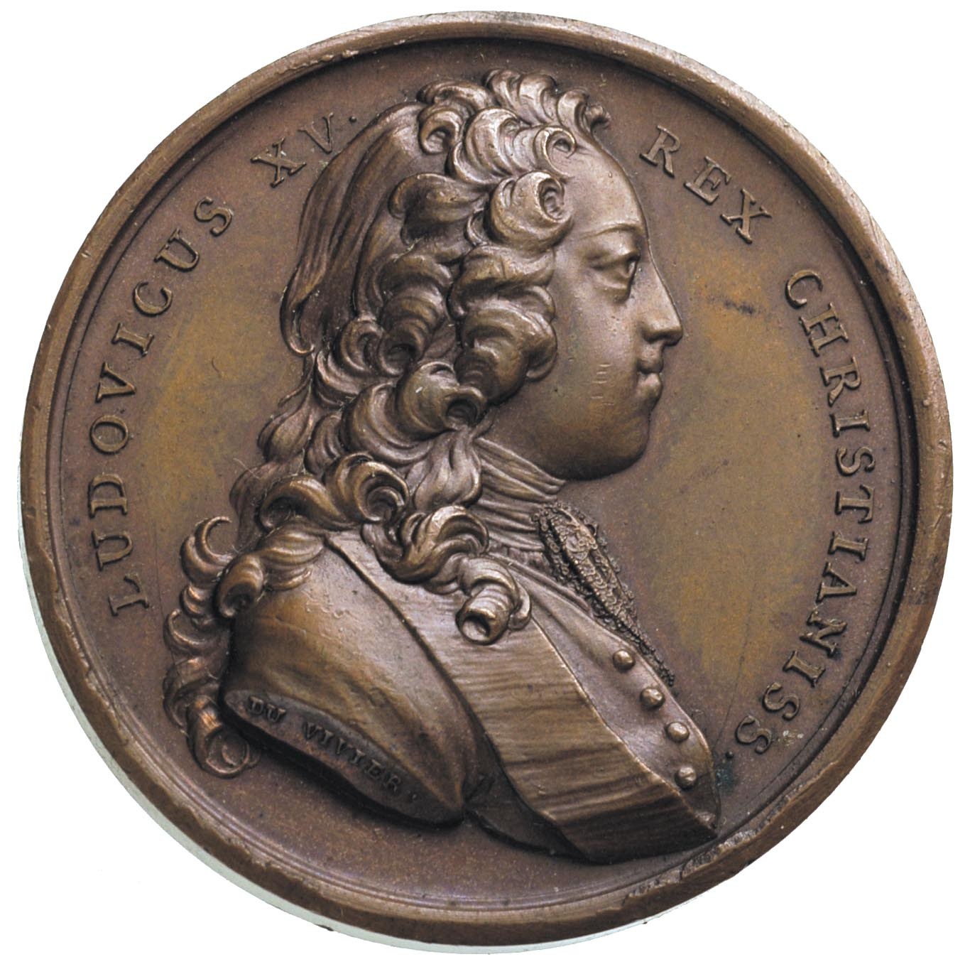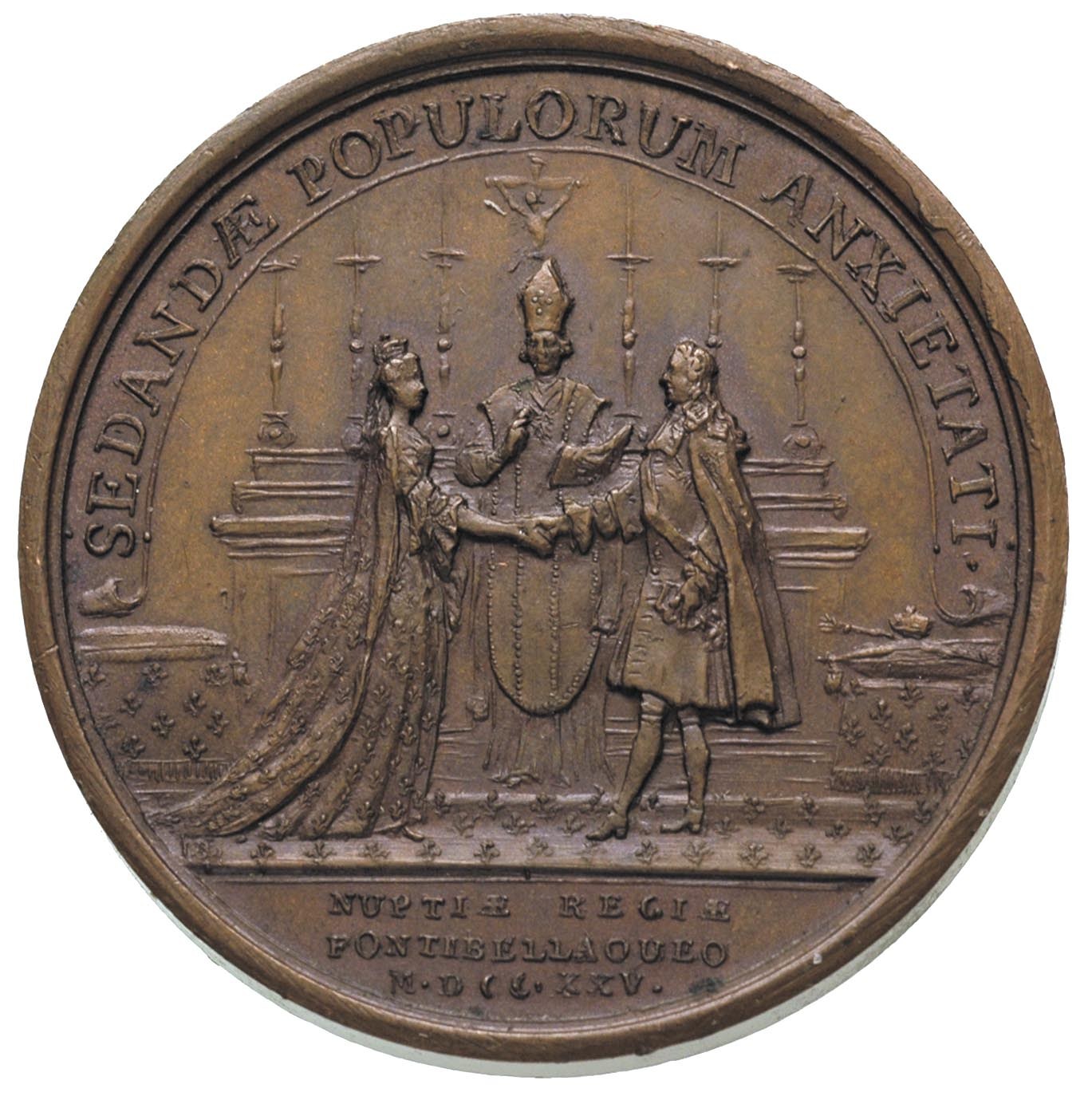 FRANCJA, Ludwik XV, -medal zaślubinowy 1725 r., Aw: Popiersie w prawo, na ramieniu sygn. Du Vivier, w otoku napis LUDOVICUS XV REX CHRISTIANISS, Rw: Scena sakramentu małżeństwa, powyżej w półkolu napis SEDANDAE POPULORUM ANXIETATI, poniżej w odcinku napis NUPTIAE REGIAE FONTIBELLAOUEO MDCCXXV, brąz 38.94 g, 42 mm, H-Cz. 2739, małżonką Ludwika została córka Leszczyńskiego - Maria