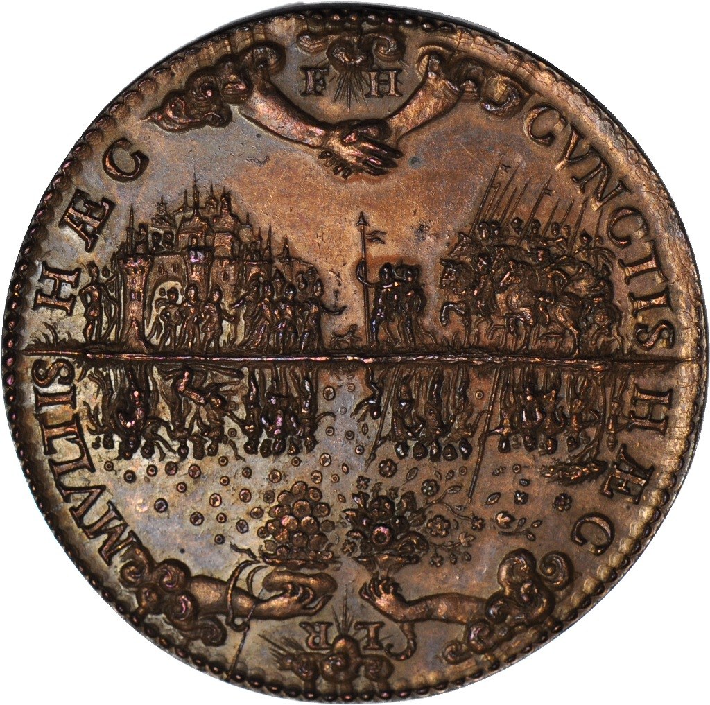 Medal na pamiątkę ugody Henryka III króla Francji i Polski z wojskami najemnymi w 1587 roku – niezwykła kompozycja. Awers: Popiersie Henryka III zwrócone w prawo, w zbroi z ornamentem z kryzą oraz w wieńcu laurowym na głowie, poniżej ornament. Wokół głowy napis: HENRICVS•III•D•G•FRANCORVM•ET•POL•REX (Henryk III, z Bożej łaski król Francuzów i Polski). Na obrzeżu perełkowa obwódka. Rewers: Dwie sceny przedstawione w pionowym odbiciu lustrzanym. Pierwsza przedstawia dwie ręce wynurzające się z chmur, lewa sypie kwiaty i owoce a prawa pieniądze z sakiewki z której sypią się na zebranych poniżej żołnierzy monety. Po bokach napis: HÆC – MVLTIS (Dla wielu). Ponad rękami wynurza się słońce z chmur, po bokach litery L[iberalitas] – R[egia] (Hojność Królewska). Po obróceniu medalu, druga scena przedstawia : z lewej strony wychodzący z zamku wojsko, które prowadzi pies, po środku rycerze ze sztandarem przed grupą konnych rycerzy; nad nimi wyłaniające się z chmur dwie ręce w uścisku. Na górze ukazuje się słońce ukryte za chmurami, po bokach litery F[ides] – H[enrici] (Dobra wiara Henryka). Po bokach napis: HÆC – CVNCTIS (Dla wszystkich). Na obrzeżu perełkowa obwódka, śr. 46 mm, waga 34,5 grama. Ciekawy kompozycyjnie rewers w nietypowy sposób przedstawiający na medalu dwie sceny stwarzające pozory odbicia lustrzanego.
