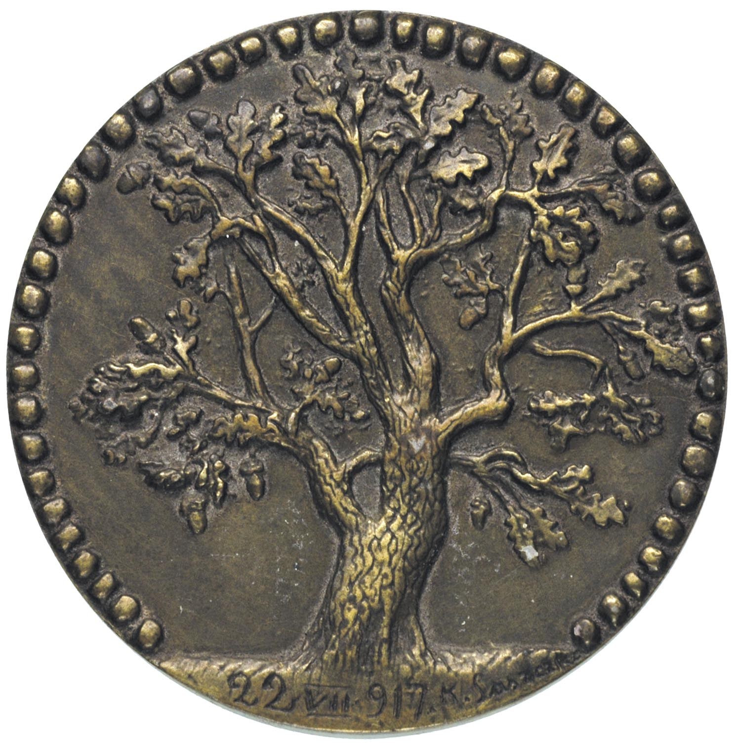 POLSKA, medal autorstwa Konstantego Laszczki poświęcony Józefowi Piłsudskiemu 1917 r., Aw: Popiersie Piłsudskiego w lewo i napis poziomy JÓZEF PIŁSUDSKI TWÓRCA LEGIONÓW, Rw: Drzewo dębowe w obwódce perłowej, w odcinku napis 22.VIII.917 i K. Laszczka, brąz 60 mm, Strzałkowski 417