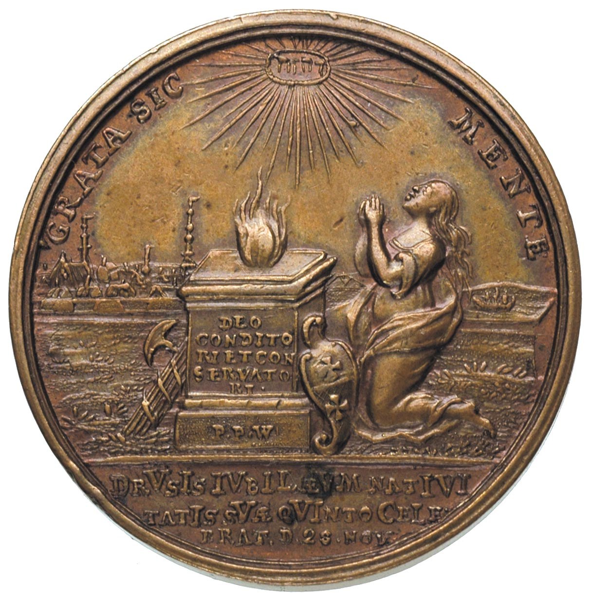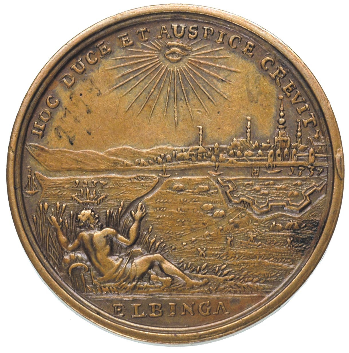 POLSKA, medal autorstwa P.P.Wernera wybity z okazji 500-lecia Elbląga 1737 r., Aw: Kobieta z rozpuszczonymi włosami modli się przy zapalonym ołtarzu, w tle widok miasta w otoku GRATA SIC MENTA, napis w odcinku z datą chronostychową, Rw: Bóg rzeki spogląda w kierunku ufortyfikowanego miasta, u góry napis HOC DUCE ET AUSPICE CREVIT i napis w odcinku ELBINGA, brąz 18.55 g, 36 mm, H-Cz. 2759 R2, Pfau 1015/1016