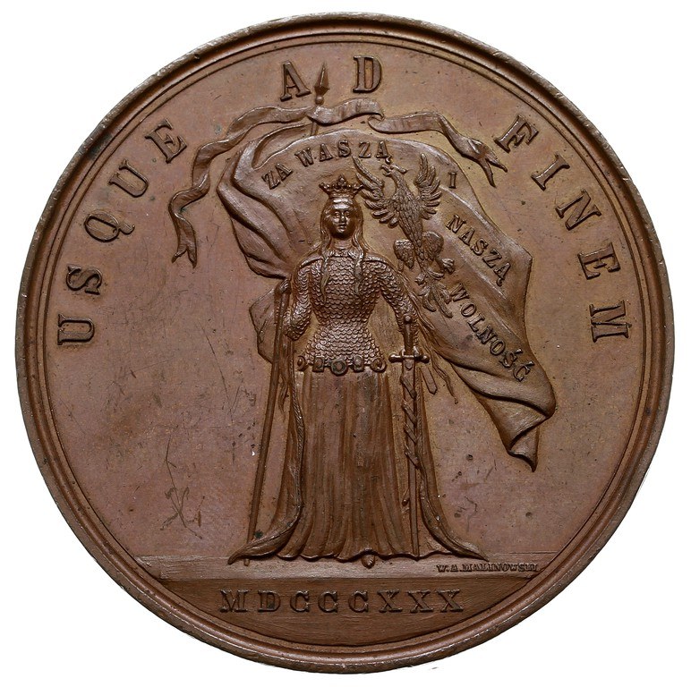POLSKA, medal autorstwa W. A. Malinowskiego na 50 rocznicę Powstania Listopadowego, 1880 r., Aw: Stojąca Polonia w kolczudze, z mieczem i sztandarem, napis w otoku USQUE AD FINEM, Rw: W wieńcu napis poziomy POLSKA BOHATEROM POWSTANIA..., brąz 64 mm, H-Cz. 8043, bardzo ładny, patyna