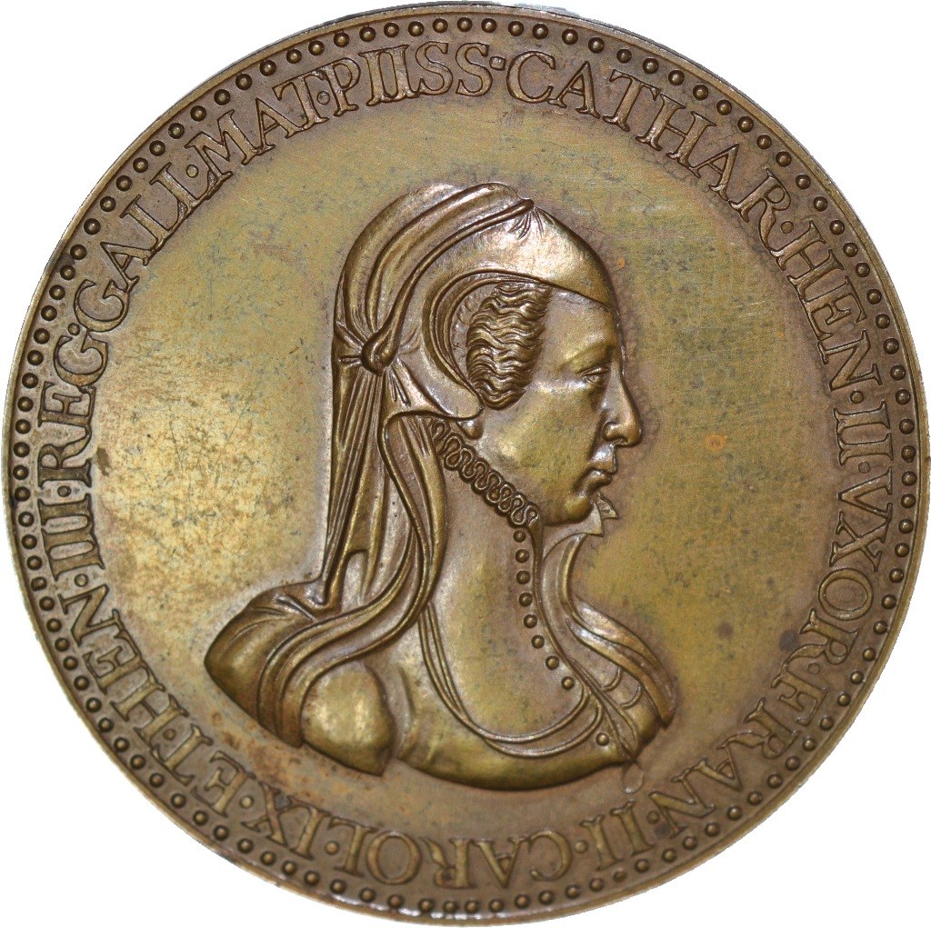 Katarzyna Medycejska i trzej jej synowie - medal bez daty. Awers: Popiersie Katarzyny zwrócone w prawo, w kwefie i wdowiej sukni. Wokół napis: CATHAR•HEN•II•VXOR•FRAN•II•CAROL•IX•ET•HEN•III•REG•GALL•MAT•PIIS• (Katarzyna, żona Henryka II, Franciszka II, Karola IX i Henryka III, królów Francuzów, matka świątobliwa). Na obrzeżu perełkowa obwódka. Rewers: Popiersia w wieńcach laurowych trzech synów Katarzyny: od lewej Franciszek II, Henryk III, Karol IX. W otoku napis: FRANCISC•II• CAROL•IX•REGES• GALL•HENRIC•III•GALL•ET•POL•REX (Franciszek II, Karol IX, królowie Francji, Henryk III, król Francji i Polski). Na obrzeżu perełkowa obwódka, napis BRONZE i punca, śr. 55 mm, waga 72,5 grama. Pięknie zachowany - lustro mennicze. Prawdopodobnie XIX-wieczna lub późniejsza odbitka medalu, ale nawet Hutten Czapski miał je w swoje kolekcji. Katarzyna Medycejska zwana jest matką królów. Z dziesięciorga dzieci, trzech synów – przedstawionych na medalu – zostało królami Francji w tym Henryk III był dodatkowo królem Polski a trzy córki zostały żonami – królowymi władców europejskich. W Polsce nie są znane medale wybite za panowania króla Henryka III Walezego. Jedyne znane to te, które były bite w tym okresie we Francji a na których widnieje tytuł króla Polski (POL REX), którego to tytułu monarcha używał do końca życia (pomimo ucieczki z Polski). Chociażby z tego powodu medal wart włączenia do kolekcji.