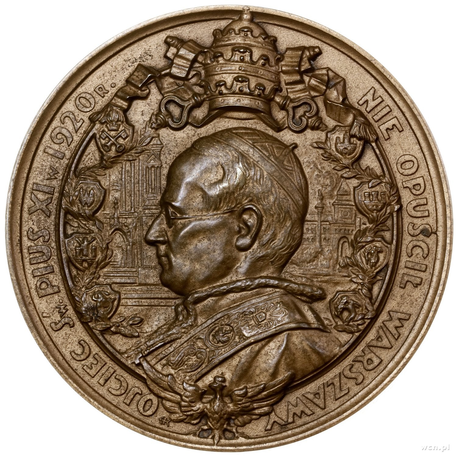 II Rzeczpospolita Polska (1918–1939), Medal na pamiątkę 10. rocznicy cudu nad Wisłą, 1930, projektu Stefana Rufina Koźbielewskiego, Warszawa; Aw: Na tle Warszawy popiersie papieża Piusa XI w lewo w ozdobnym otoku, niżej orzeł z rozpostartymi skrzydłami, NIE OPUŚCIŁ WARSZAWY - OJCIEC Św. PIUS XI w 1920 R.; Rw: Mapa terytorium Polski, w otoku w kręgach napisy W DZIESIĄTĄ ROCZNICĘ CUDU NAD WISŁĄ / W 1683 R. JAN SOBIESKI KRÓL POLSKI OCALIŁ POD WIEDNIEM CHRZEŚCIJAŃSTWO OD NAJAZDU TURKÓW / W 1920 R. NARÓD POLSKI OCALIŁ NAD WISŁĄ CHRZEŚCIJAŃSTWO OD NAWAŁY BOLSZEWICKIEJ; Strzałkowski 680 (R); brąz, 55.2 mm, 70.07 g; medal w oryginalnym pudełku Mennicy Państwowej, bardzo ładny.