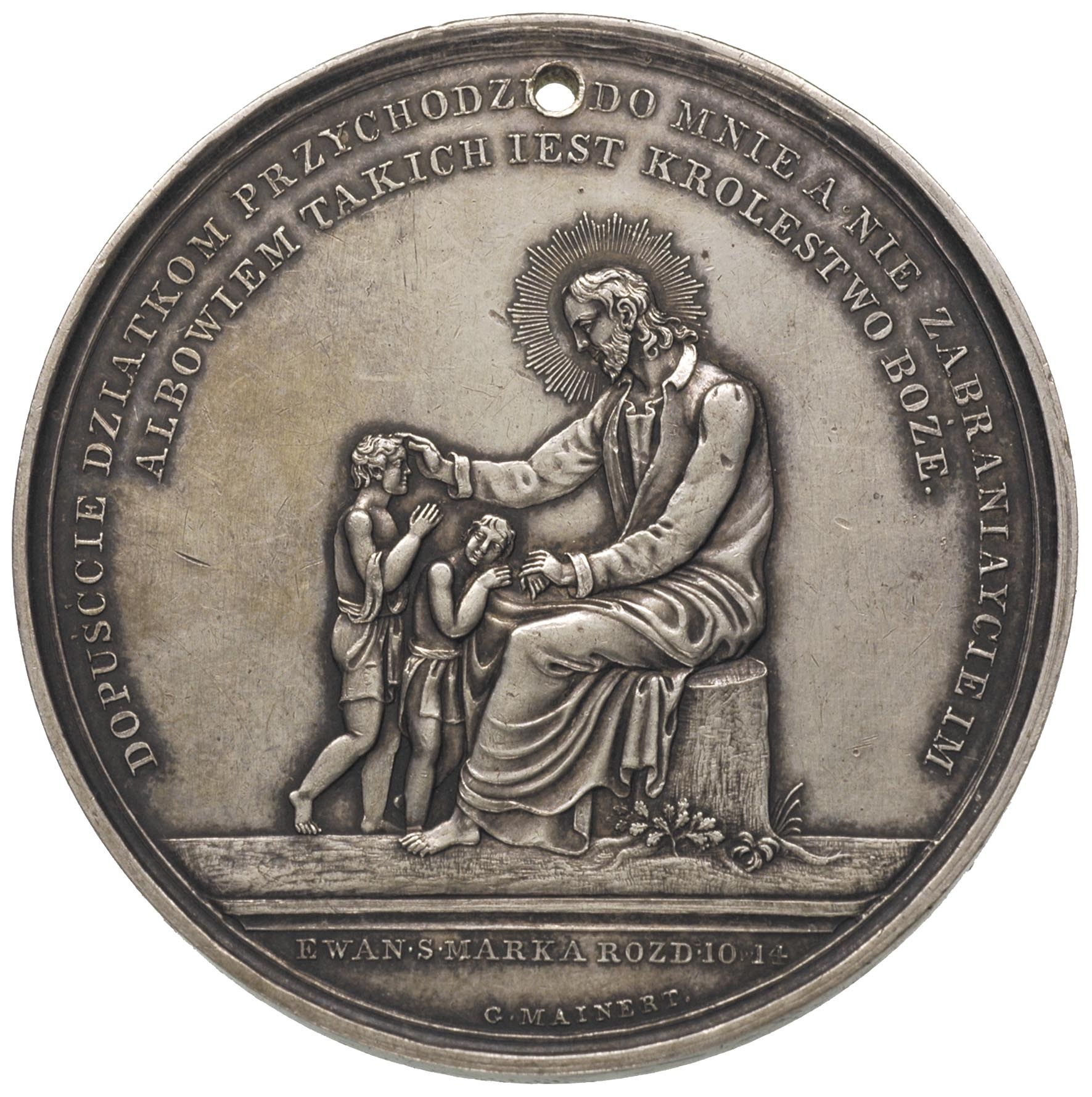 POLSKA, medal na pamiątkę chrztu autorstwa J. Majnerta, Aw: Chrystus siedzący na pniu błogosławiący dzieci, poniżej napis EWAN.S.MARKA.ROZD.10 w 14, w otoku napis DOPUŚCCIE DZIATKOM PRZYCHODZIĆ DO MNIE...., Rw: Napis NA PAMIĄTKĘ CHRZTU, srebro 63.82 g, 54.5 mm, H-Cz. 4135, Rewoliński 1346, medal przedziurawiony