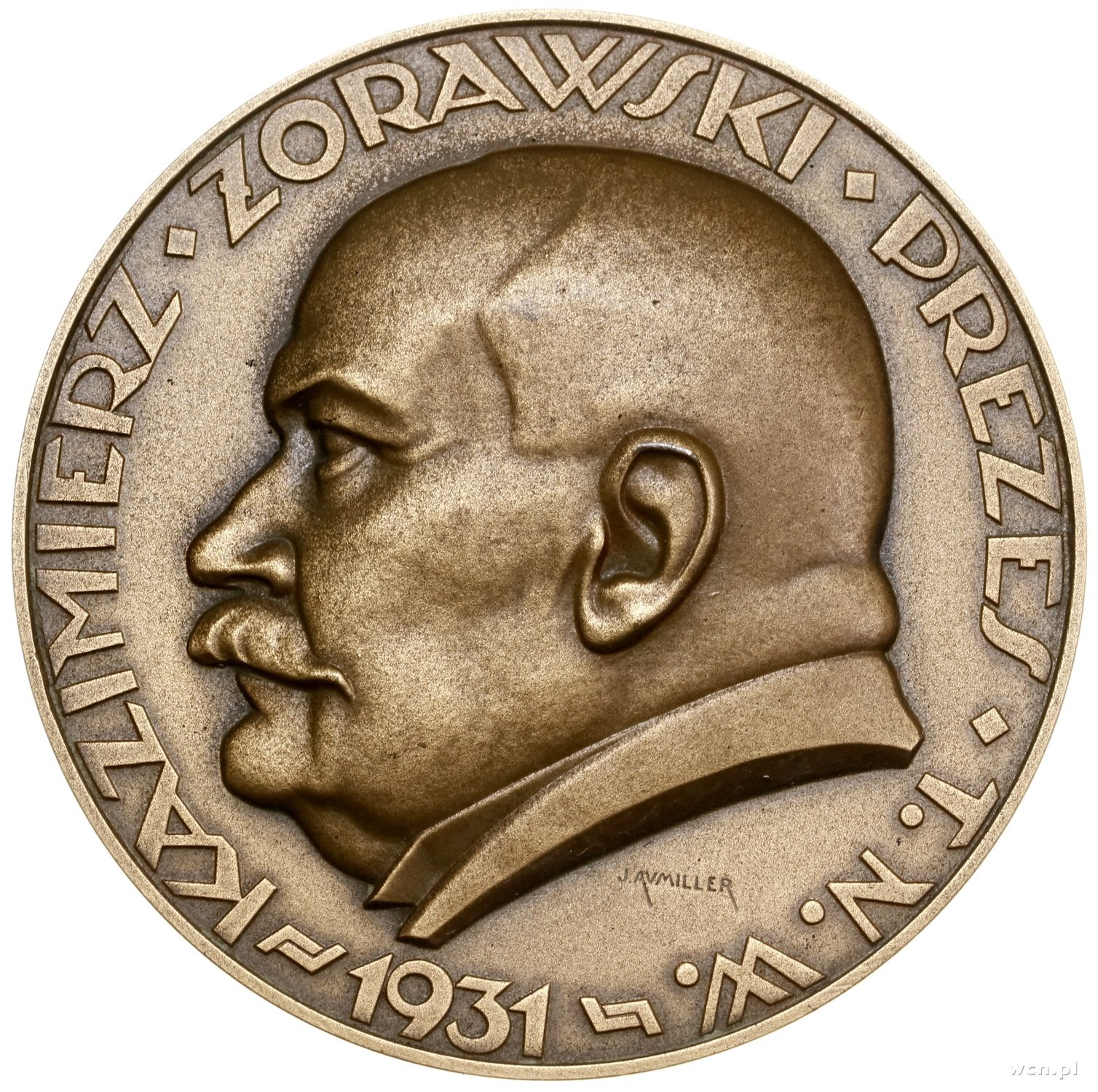 II Rzeczpospolita Polska (1918–1939), Medal na pamiątkę odbudowy Pałacu Staszica, 1931, projektu Józefa Aumillera, Warszawa; Aw: Głowa w lewo, niżej sygnatura J.AVMILLER, KAZIMIERZ • ŻORAWSKI • PREZES • T.N.W. = 1931=; Rw: Fasada Pałacu Staszica w Warszawie / DLA VPAMIĘTNIENIA / ODBVDOWY / PAŁACV STASZICA / SIEDZIBY / TOW. NAVK. WARSZ.; Strzałkowski 701 (R); brąz, 55.4 mm, 74.29 g; medal w pudełku Mennicy Państwowej, wyśmienity, delikatna, gabinetowa patyna. Kazimierz Żorawski urodził się w 1866 roku w Szczukach, gdzie jego ojciec dzierżawił majątek. W latach 1884–1888 studiował fizykę i matematykę na Cesarskim Uniwersytecie Warszawskim. W międzyczasie, w rodzinnym majątku, przyjęto Marię Skłodowską jako guwernantkę. Młodzi szybko zakochali się w sobie i zaręczyli, jednak rodzice Kazimierza nie wyrazili zgody na ślub z ubogą nauczycielką, a Kazimierz nie potrafił im się przeciwstawić. W kolejnych latach Kazimierz studiował w Getyndze, Paryżu i Lipsku, gdzie obronił w 1891 roku doktorat. Następnie pracował na Politechnice Lwowskiej, Uniwersytecie Jagiellońskim (w latach 1917–1918 był rektorem), Uniwersytecie Warszawskim i Politechnice Warszawskiej. W Krakowie współzakładał Towarzystwo Matematyczne. Od 1900 roku był członkiem Akademii Umiejętności, od 1921 roku członkiem Towarzystwa Naukowego Warszawskiego (w tym prezesem w latach 1921–1931) a od 1952 roku członkiem PAN. Zmarł w 1953 roku, został pochowany w grobowcu rodzinnym na Cmentarzu Powązkowskim w Warszawie.