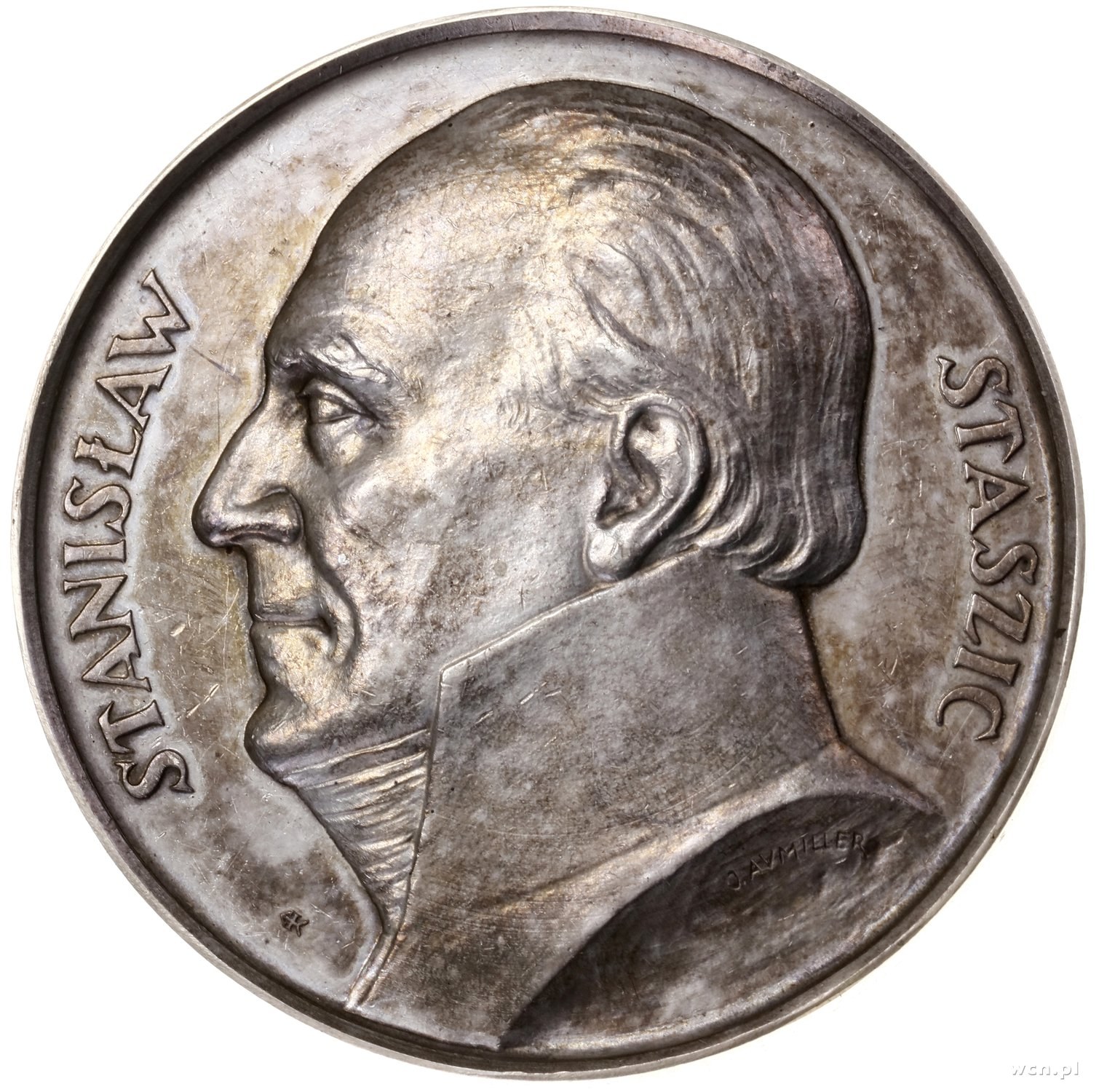 II Rzeczpospolita Polska (1918–1939), Medal na pamiątkę setnej rocznicy śmierci Stanisława Staszica, 1926, projektu Józefa Aumillera, Warszawa; Aw: Popiersie Stanisława Staszica w lewo, na odcięciu popiersia sygnatura J.AVMILLER, STANISŁAW STASZIC; Rw: PAŚĆ MOŻE / I NARÓD WIELKI, / ZNISZCZEĆ- / TYLKO NIKCZEMNY, niżej T.N.W. / 1926; Strzałkowski 565 (R); srebro, 54.2 mm, 80.02 g; medal w oryginalnym pudełku Mennicy Państwowej, przetarte tło, medal wybity z inicjatywy Sekcji Numizmatycznej Towarzystwa Miłośników Historii przez Towarzystwo Naukowe Warszawskie.