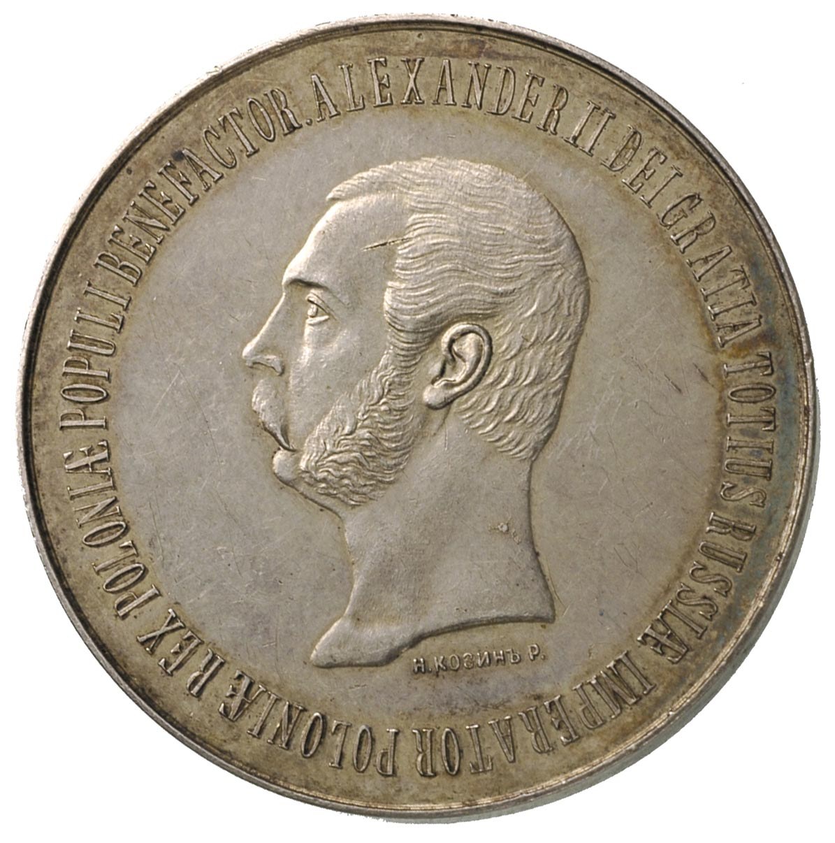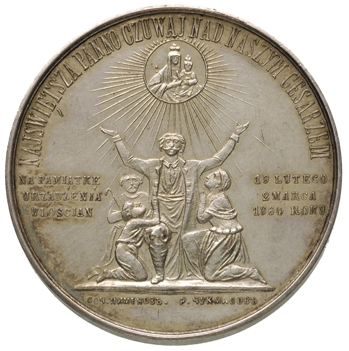 POLSKA, medal na uwłaszcenie chłopów w Królestwie Polskim 1864 r., Aw: Popiersie cara Aleksandra II w lewo, poniżej sygn. Kozin i napis w otoku, Rw: Pod obrazem Matki Boskiej klęcząca grupa włościan, napisy w polu i w otoku, srebro 24.97 g, 36.5 mm, H-Cz. 6757, Diakow 724.1 R2