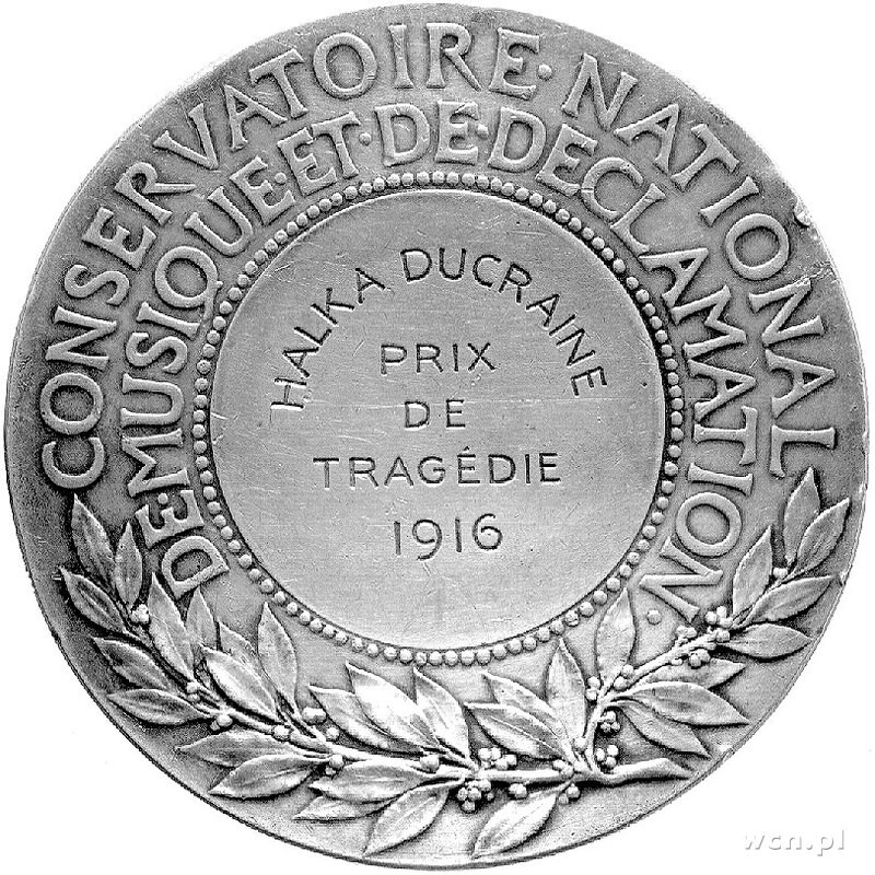 FRANCJA, medal nagrodowy autorstwa Chaplaina, Aw: Personifikacje muzyki i tragedii, u dołu sygn. J. C. CHAPLAIN, Rw: Napis w środkowej tarczy: HALKA DUCRAINE PRIX DE TRAGEDIE 1916; w otoku napis: CONSER- VATOIRE NATIONAL DE MUSIQUE ET DE DECLAMATION, srebro 68 mm