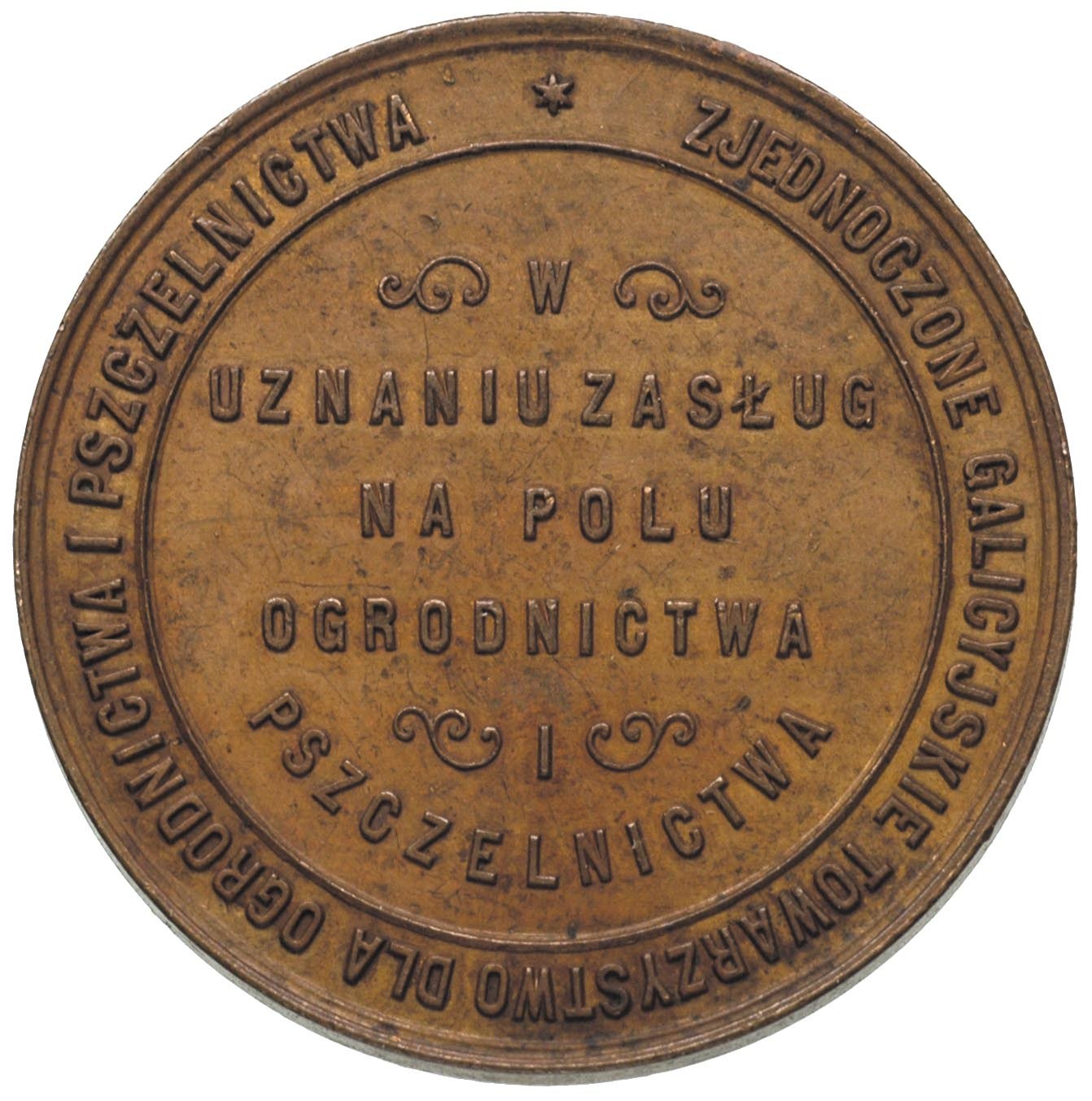 POLSKA, medal nagrodowy bez daty /ok.1900/, Aw: Kobieta w długiej sukni siedząca pod drzewem, Rw: Napis poziomy W UZNANIU ZASŁUG NA POLU OGRODNICTWA I PSZCZELARSTWA, w otoku napis ZJEDNOCZONE GALICYJSKIE TOWARZYSTWO DLA OGRODNICTWA I PSZCZELARSTWA, brąz 25.01 g, 41.5 mm, patyna