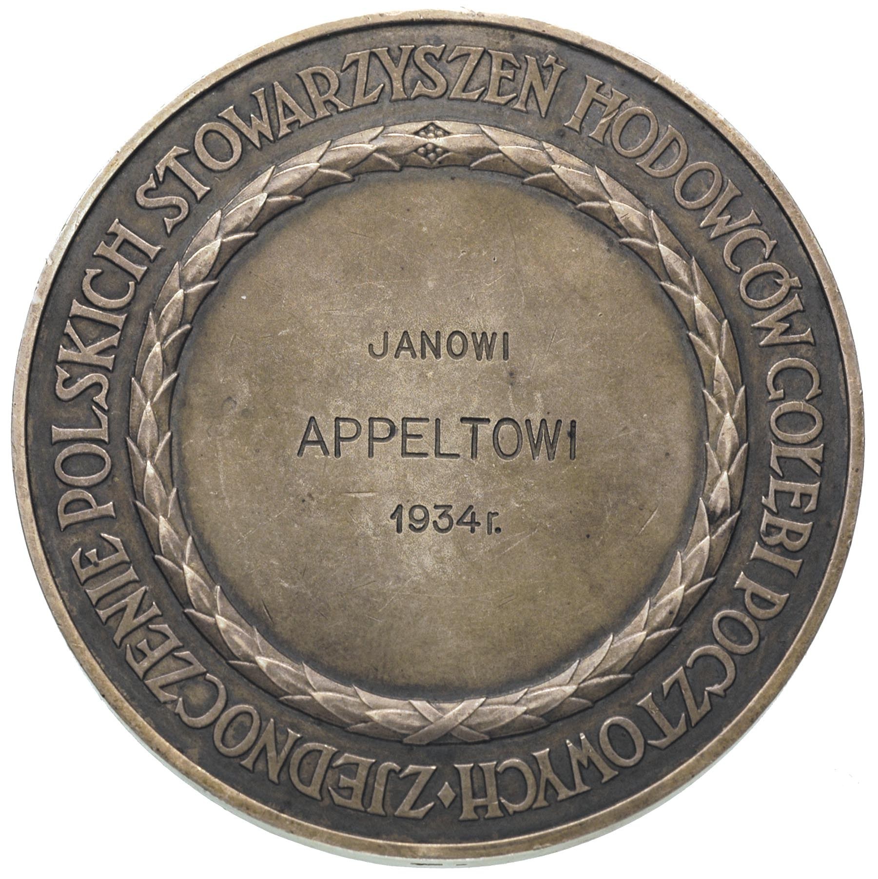 medal nagrodowy dla Jana Appelta 1934 r., Aw: W wieńcu ...