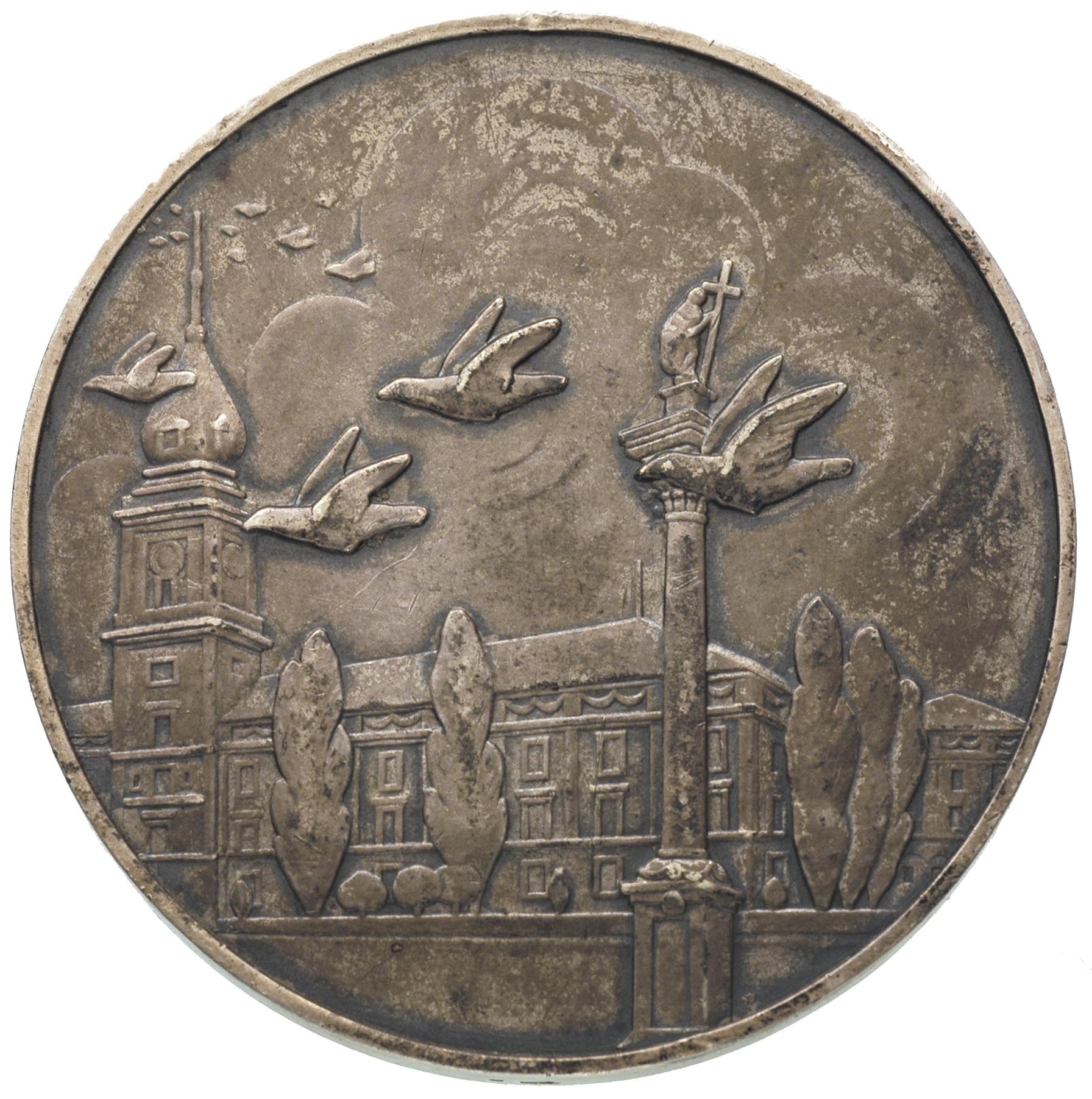 POLSKA, medal nagrodowy dla Jana Appelta 1934 r., Aw: W wieńcu imię i nazwisko nagrodzonego, w otoku napis ZJEDNOCZENIE POLSKICH STOWARZYSZEŃ HODOWCÓW GOŁĘBI POCZTOWYCH, Rw: Gołębie w locie nad Pałacem Zamkowym w Warszawie, przy cokole kolumny znak mennicy warszawskiej, na rancie próba srebra, srebro 84.90 g, 55 mm, Strzałkowski -/nie notuje/, bardzo rzadki