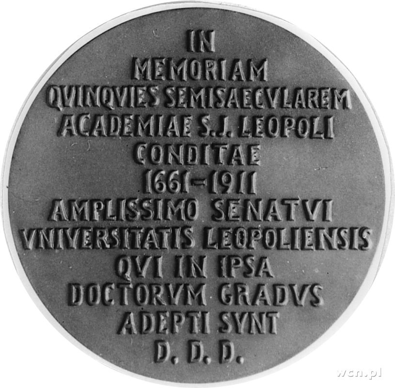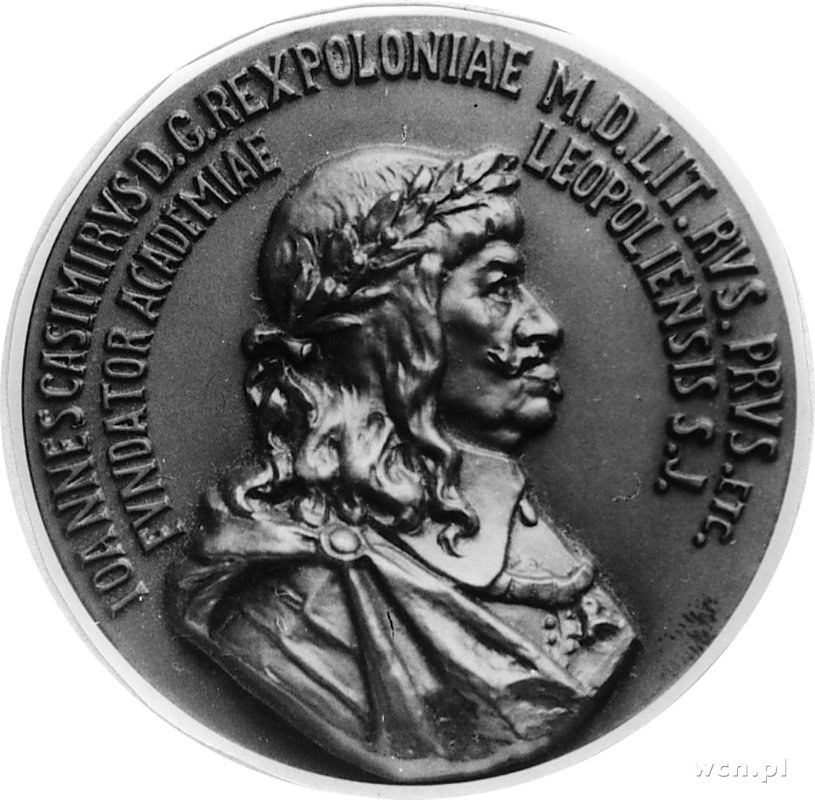 POLSKA, medal niesygnowany projektu Tadeusza Błotnickiego wykonany w Wiedniu w 250 rocznicę założenia UniwersytetuJana Kazimierza we Lwowie, Aw: Popiersie króla i napisy, Rw: Okolicznościowy napis w dwunastu wierszach,Strzałk. 190 R, brąz 60 mm, 97.19 g. wybito 400 egz.