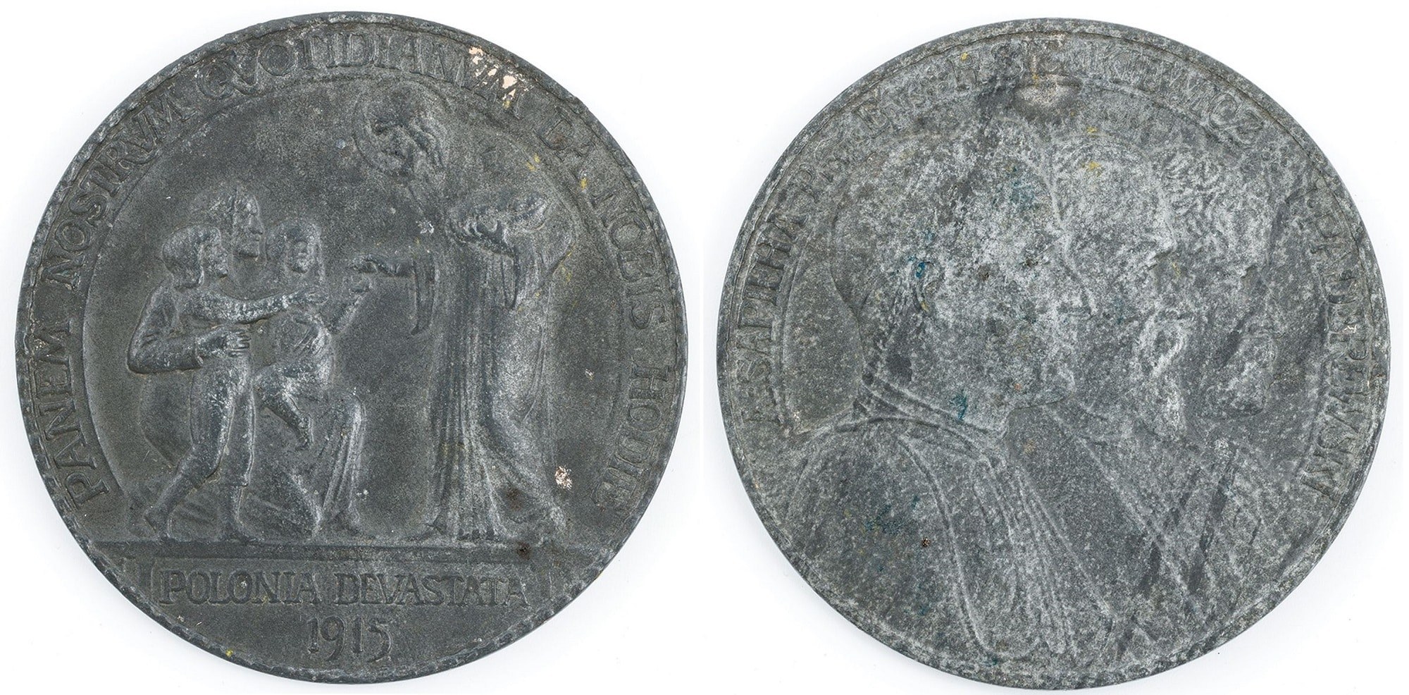 Autor: Jan Wysocki Cynk, śr. 55 mm A: Popiersia biskupa Adama Sapiehy, Henryka Sienkiewicza i Ignacego Paderewskiego w prawo, wokoło A•SAPIEHA Pr-ceps Ep-us (kwiat) H. SIENKIEWICZ (kwiat) I. PADEREWSKI R: Chrystus podający chleb dzieciom i matce, wokoło PANEM NOSTRVM QVOTIDIANVM DA NOBIS HODIE, w odcinku POLONIA DEVASTATA / 1915 Strzałkowski 324 Pochodzenie: Kolekcja śp Jacka Palowskiego Cena wywoławcza 200 Estymacja 300 - 400