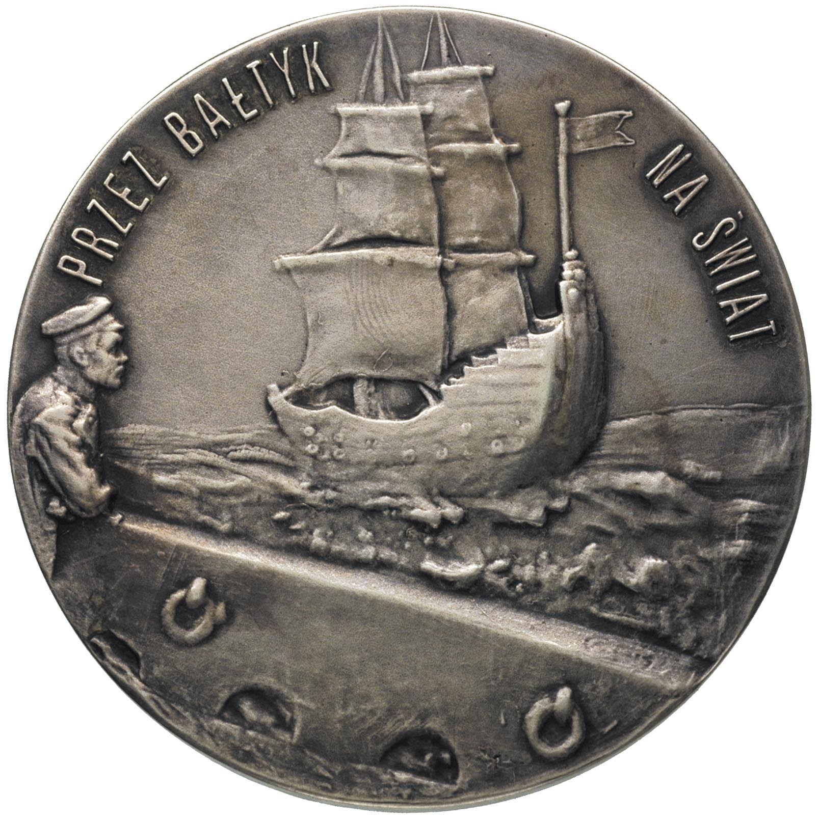 POLSKA, medal projektu Czesława Makowskiego na pamiątkę odzyskania dostępu do morza 1920 r., Aw: Popiersie rybaka w lewo, po prawej data 10.II.1920, Rw: Żaglowiec dwumasztowy na morzu, z lewej strony marynarz stojący przy burcie, powyżej w półkolu napis PRZEZ BAŁTYK NA ŚWIAT, srebro 49.87 g, 50 mm, Strzałkowski 471 R