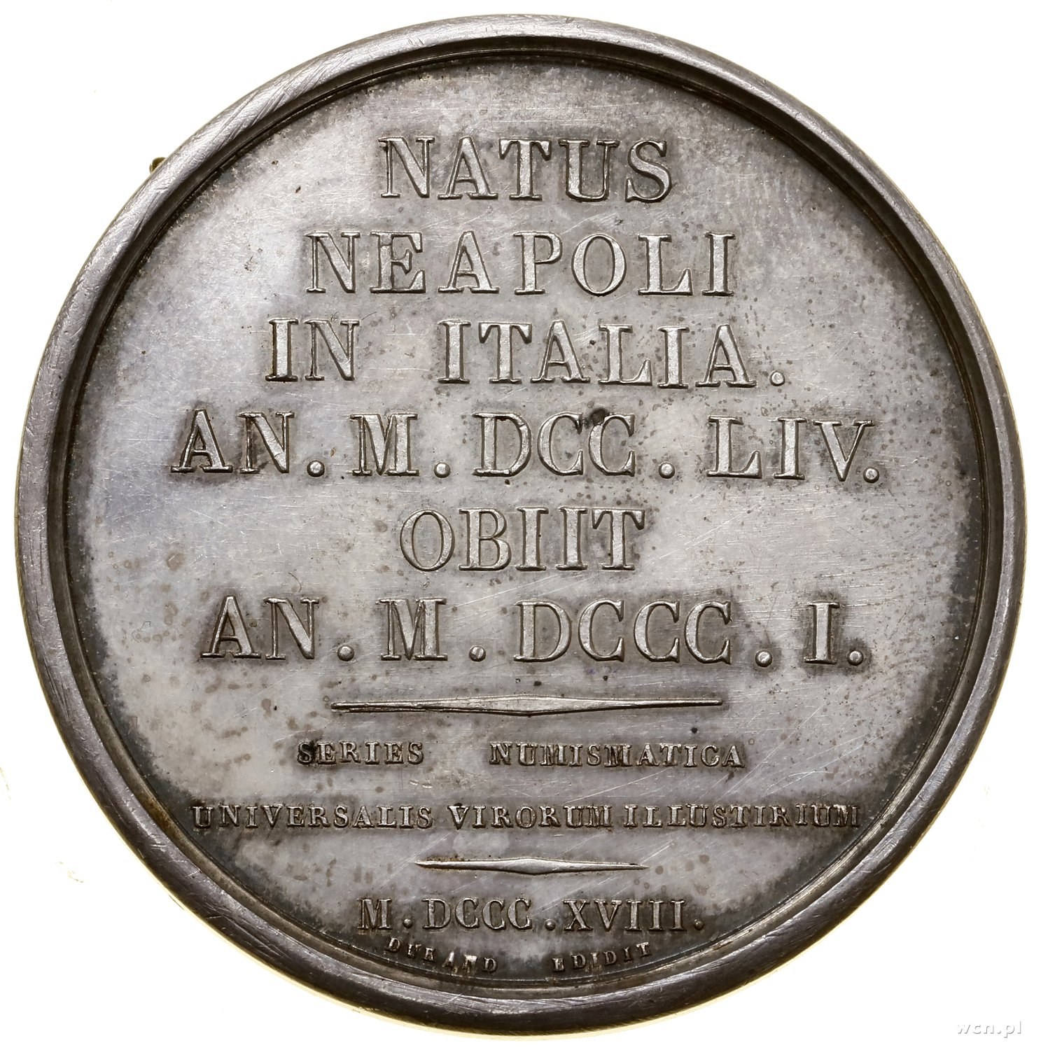 FRANCJA, Medal upamiętniający Domenico Cimarosę, 1818, projektu Jeana-Jacquesa Barre; Aw: Popiersie w lewo, niżej sygnatura BARRE F, DOMINICUS - CIMAROSA; Rw: NATUS / NEAPOLI / IN ITALIA / AN. M. DCC. LIV. / OBIIT / AN. M. DCCC. I. / SERIES NUMISMATICA / UNIVERSALIS VIRORUM ILLUSTIRIUM / M. DCCC. XVIII. / DURAND EDIDIT; srebro, 42.3 mm, 32.34 g; medal minimalnie przetarty, subtelna patyna, pięknie zachowany.