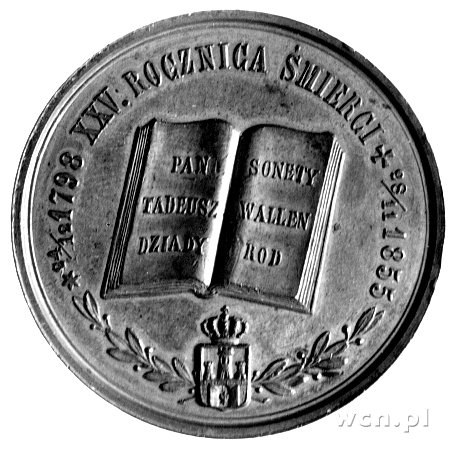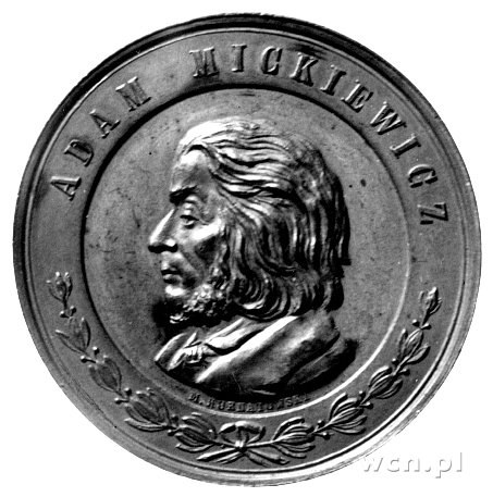 Mickieviciana, poz. 1080-1095, medal w 25 rocznicę śmierci poety wybity nakładem M. Kurnatowskiego, Aw: Popiersie w prawo i napis w otoku: ADAM MICKIEWICZ, sygn. M.KURNATOWSKI, Rw: Otwarta księga z napisem: PAN TADEUSZ, SONETY, WALLENROD; w otoku: 24.12.1798 XXV ROCZNICA ŚMIERCI 28.11.1853 i herb Krakowa, H-Cz.8105, brąz 36 mm, 20.82 g.