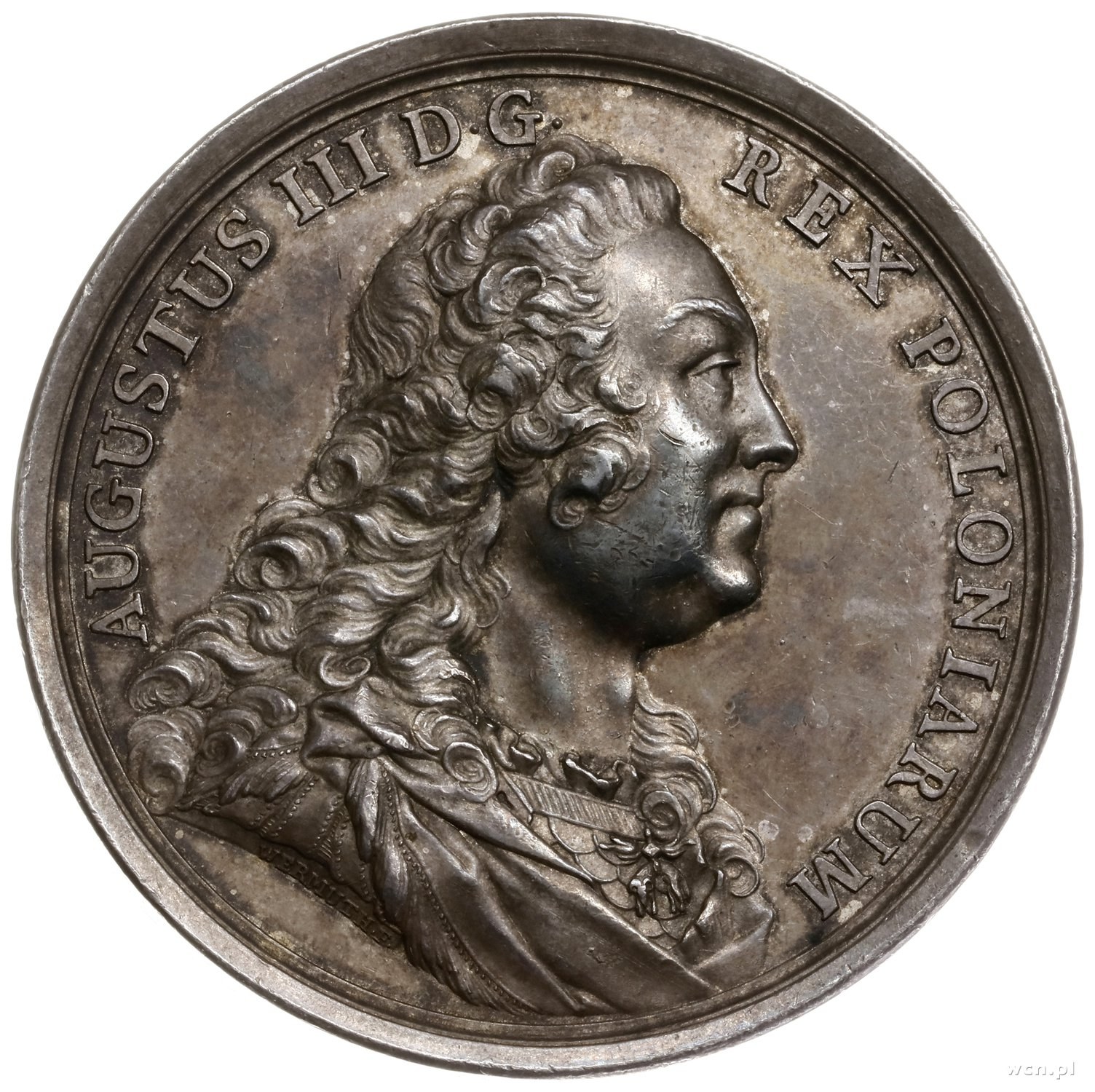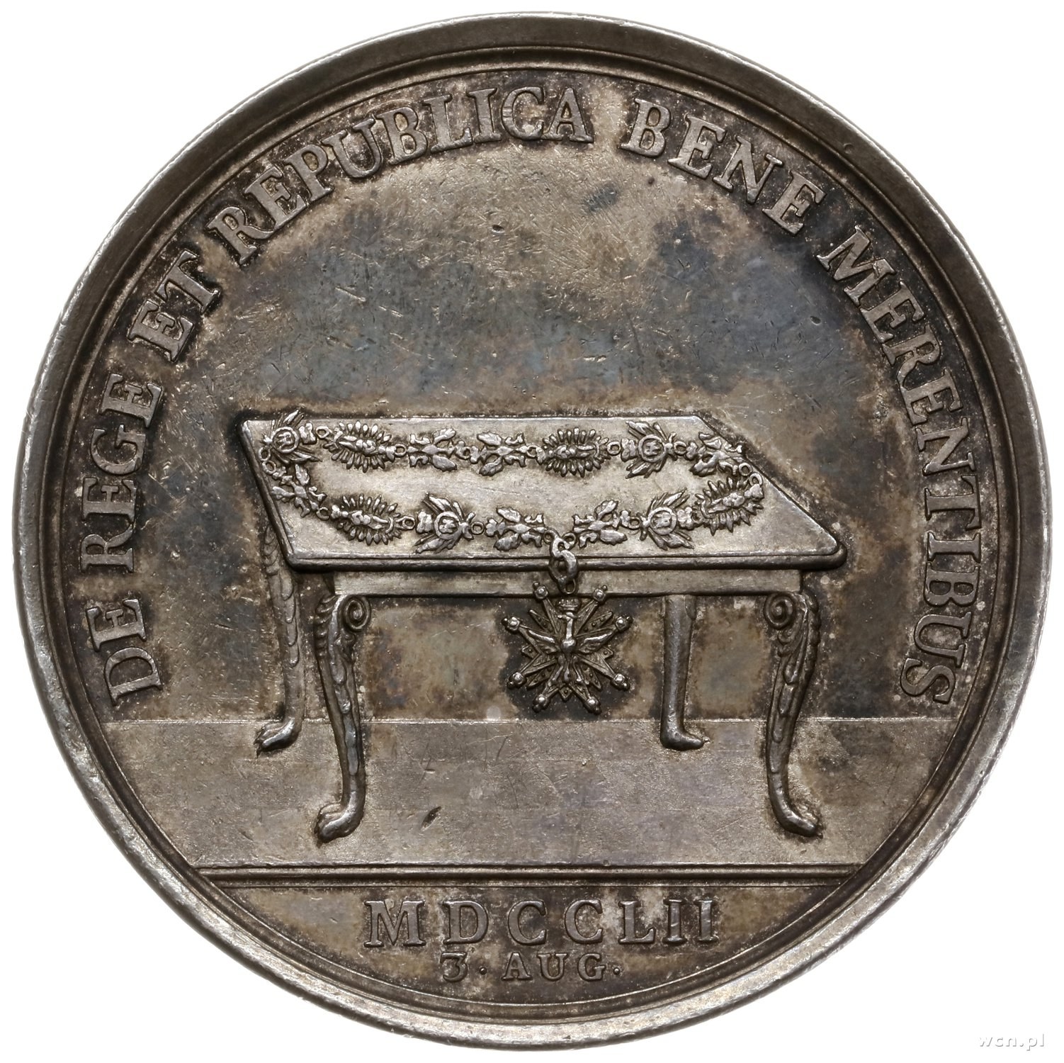 August III Sas 1733-1763, medal wybity z okazji święta Orderu Orła Białego, 1752, projektu Christiana Siegmunda Wermutha; Aw: Popiersie władcy w prawo, w dolnej części sygnatura WERMUTH•F•, w otoku AUGUSTUS III D•G• - REX POLONIARUM; Rw: Stół na którym łańcuch z Orderem Orła Białego, DE REGE ET REPUBLIKA BENE MERENTIBUS, w odcinku MDCCLII / 3•AUG•; ZKW Medale 295, H-Cz. 2792 (R1), Węsierski 2659, Raczyński 403 (podobne - z inną datą), Mikocki nie notuje z tą datą; srebro, 53 mm, 58.20 g; delikatna patyna, bardzo ładny i rzadki medal, rozdano jedynie 60 sztuk