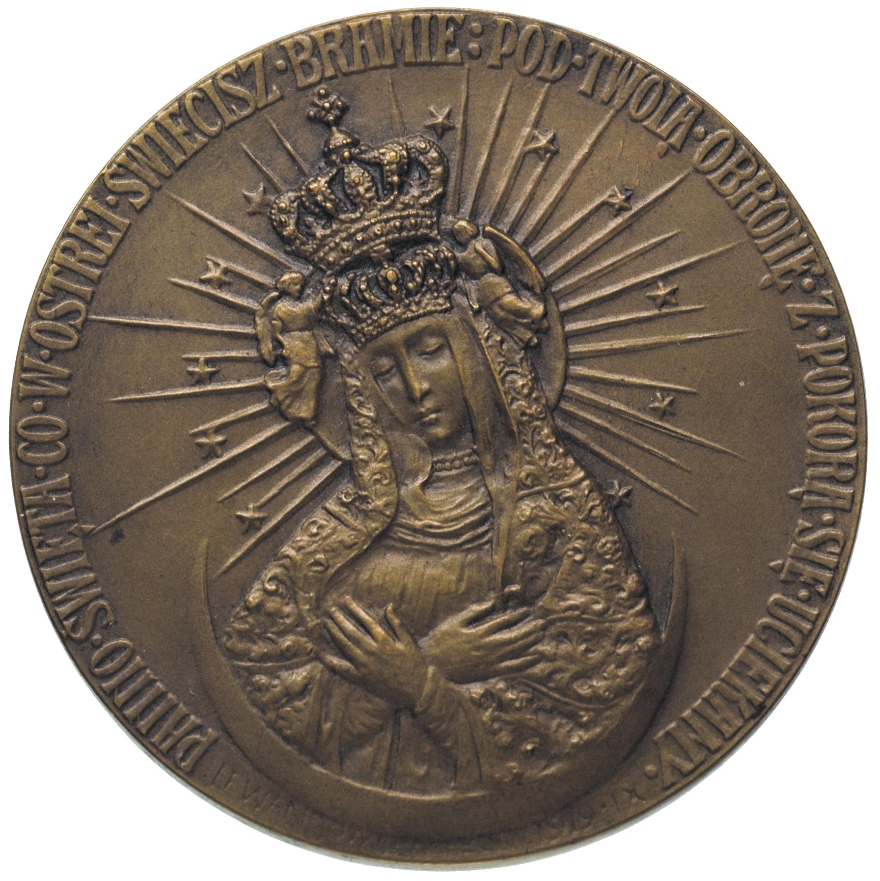 POLSKA, medal z Matką Boską Ostrobramską 1919 r., Aw: Matka Boska Ostrobramska, w otoku napis PANNO ŚWIĘTA CO W OSTREI ŚWIECISZ BRAMIE; POD TWOJĄ OBRONĘ Z POKORĄ SIĘ UCIEKAMY, sygn. Lewandowski fecit 1919 IX, Rw: Św Jerzy walczący ze smokiem, w otoku napis MIŃSK WILNO 1919 GRODNO ŁUCK / ANI OGNISTE SMOKI NAS USTRASZĄ, brąz 55 mm, Strzałkowski 445 R