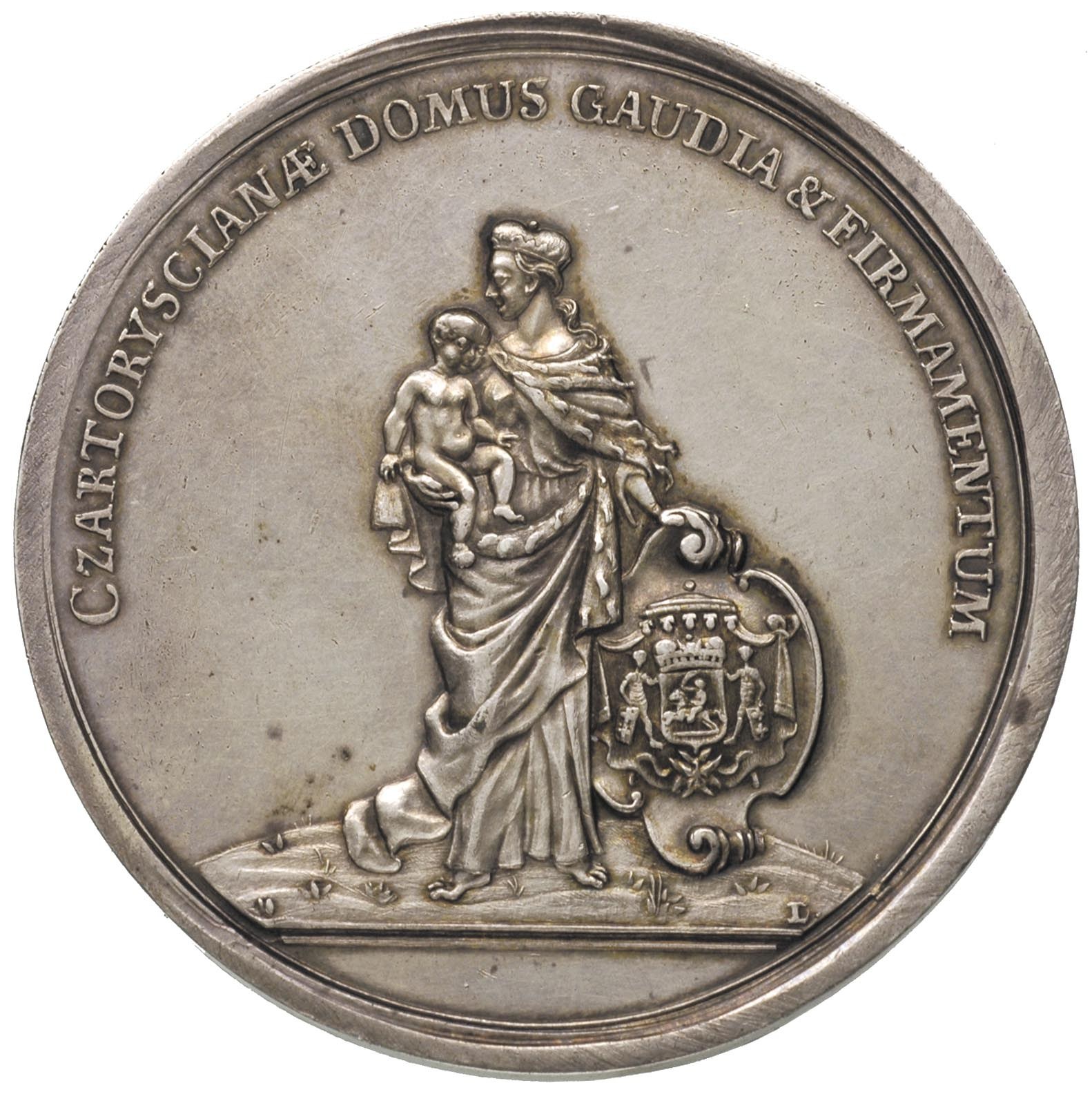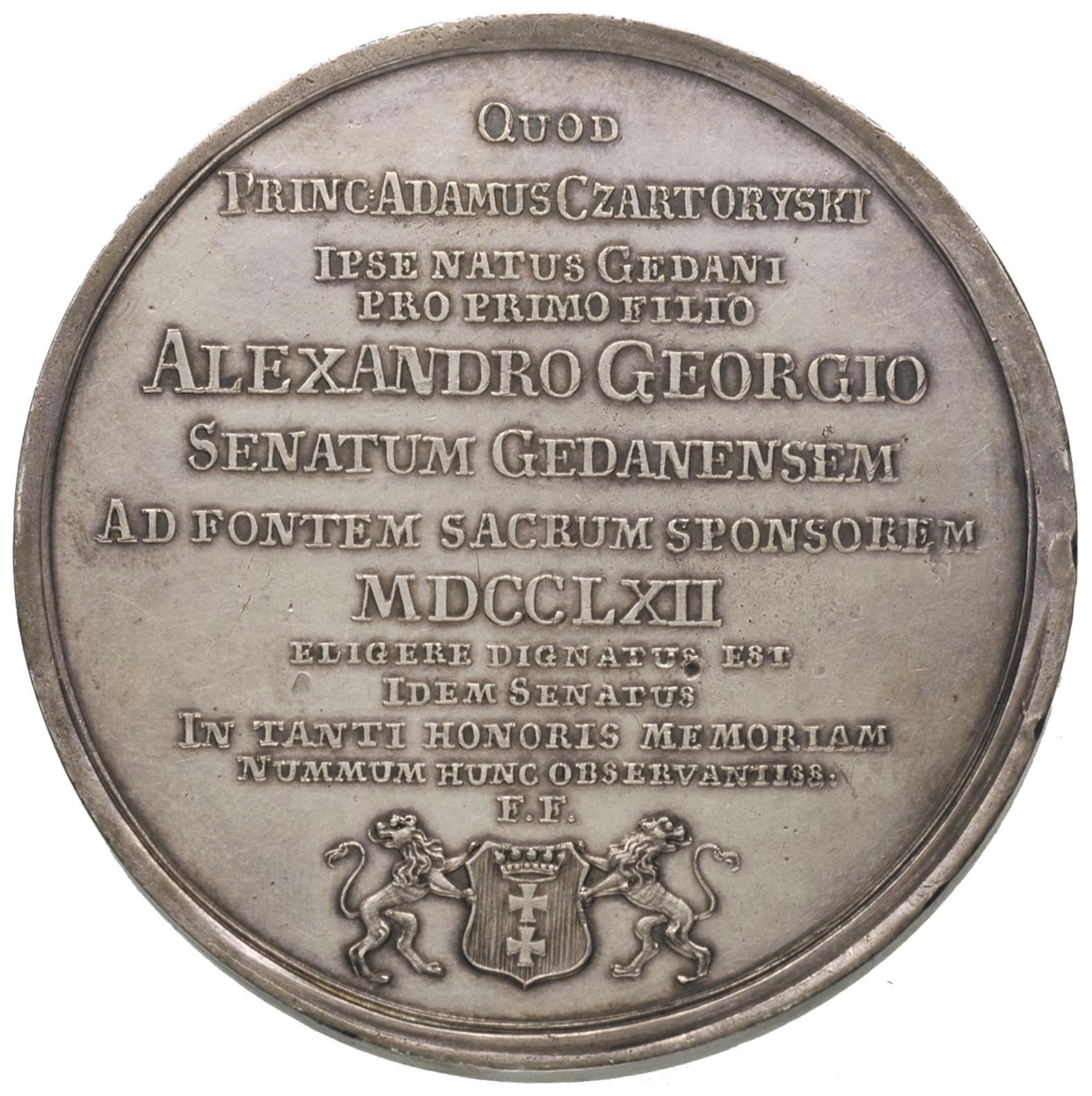 POLSKA, medal z okazji chrztu Aleksandra Jerzego Czartoryskiego syna Adama Czartoryskiego w 1762 r., Aw: Kobieta z dzieckiem na prawym ręku i podtrzymująca lewą ręką tarczę herbową, w otoku napis CZARTORYSCIANAE DOMUS GAUDIA ET FIRMAMAENTUM, Rw: Poziomy napis w 13 wierszach, poniżej herb Gdańska, srebro 95.58 g, 63.5 mm, H-Cz. 3878 R2, Racz. 420, rzadki medal wydany przez Senat Gdański, który był wybrany na ojca chrzestnego