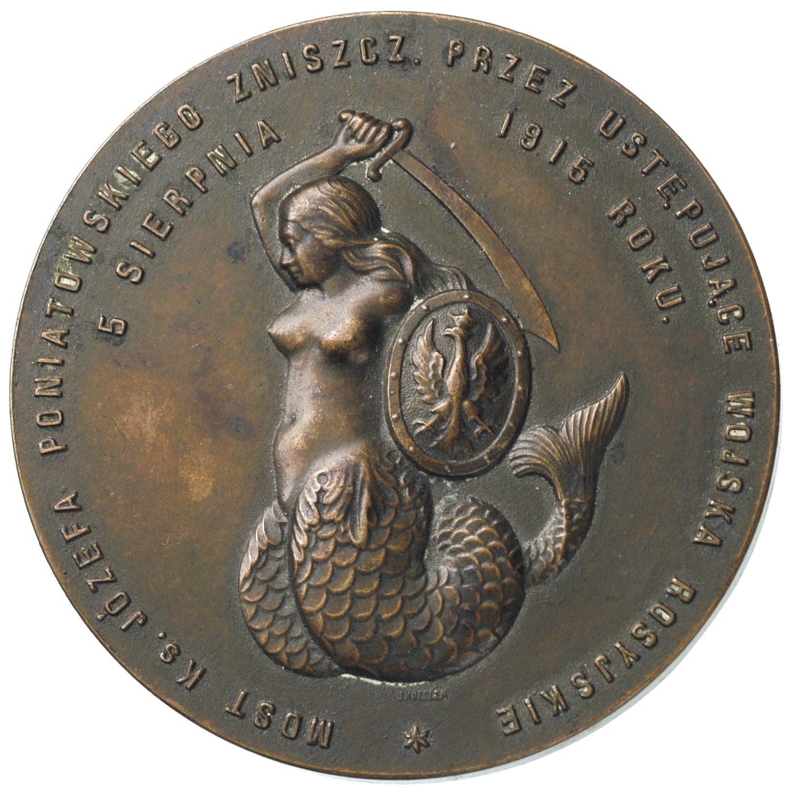 POLSKA, medal z okazji zniszczenia mostu Poniatowskiego 1915 r., Aw: Syrenka z mieczem i tarczą w lewo i napis w otoku MOST KS. PONIATOWSKIEGO ZNISZCZONY PRZEZ USTĘPUJĄCE WOJSKA ROSYJSKIE i data 5 SIERPNIA 1915 ROKU, Rw: Widok uszkodzonego mostu i napis w odcinku WARSZAWA, z lewej J. KNEDLER, brąz 50 mm, Strzałkowski 315 R