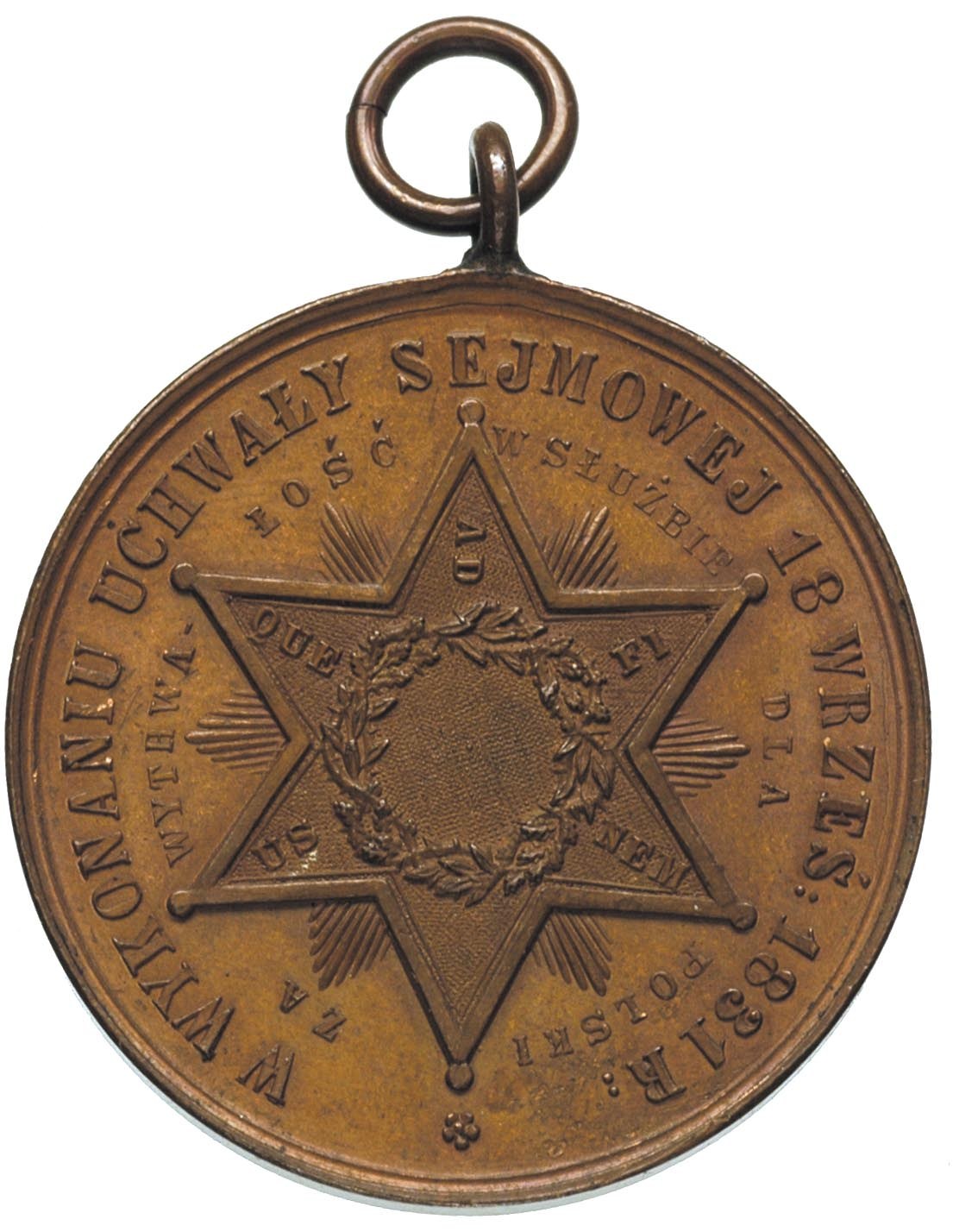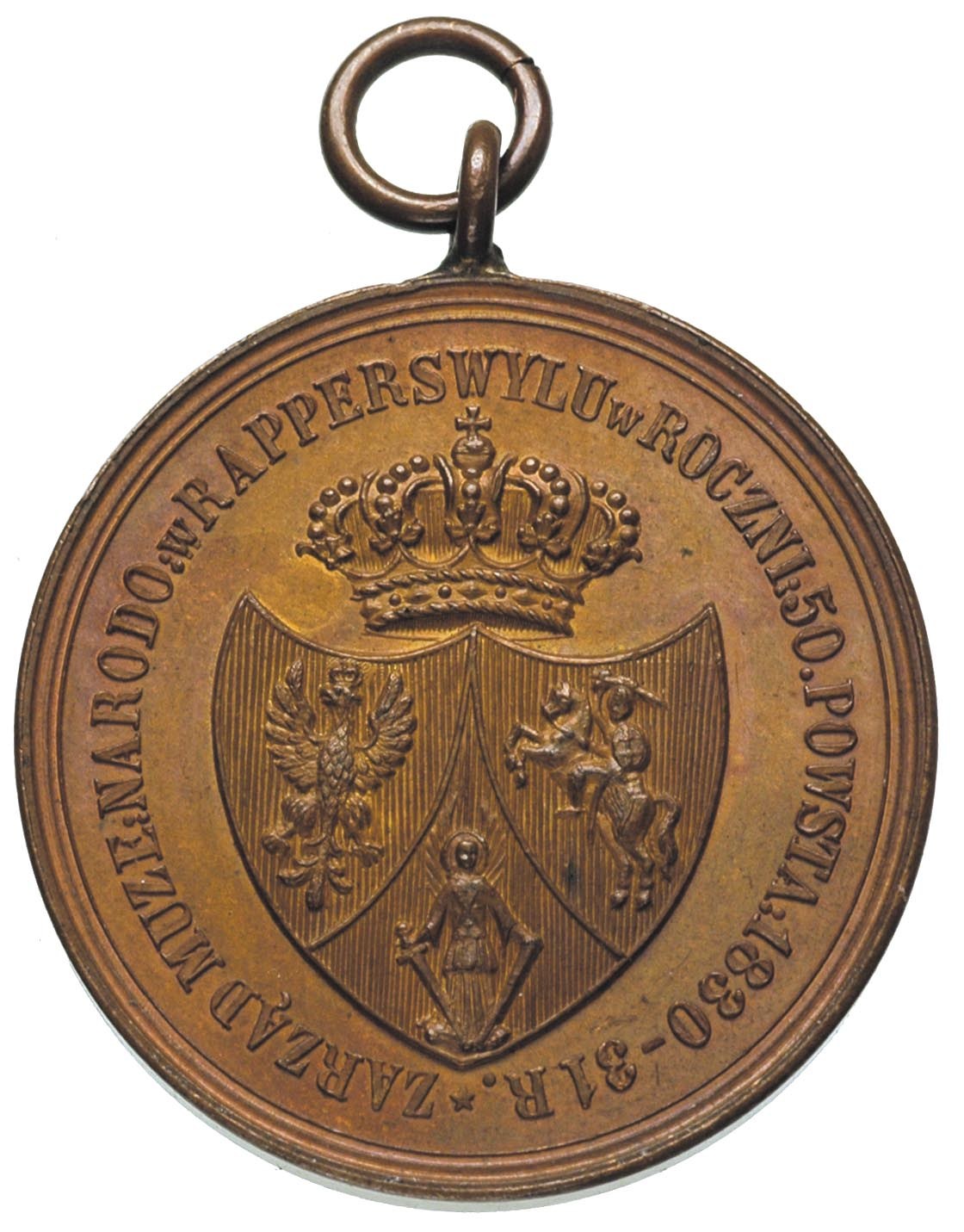POLSKA, medal z uszkiem na 50-lecie Powstania Listopadowego wydany przez Muzeum w Rapperswilu, 1880 r., Aw: Tarcza herbowa trójpolowa zwieńczona koroną, w otoku napis ZARZĄD MUZE. NARODO. w RAPPERSWYLU w ROCZNI. 50 POWSTA. 1830-31R., Rw: Gwiazda sześcioramienna z wieńcem i napisami wewnątrz, w podwójnym otoku napisy W WYKONANIU UCHAWŁY SEJMOWEJ 18 WRZEŚ: 1831R/ ZA WYTRWA-ŁOŚĆ-W SŁUŻBIE- DLA-POLSKI, miedź 34 mm, H-Cz. 8044 R