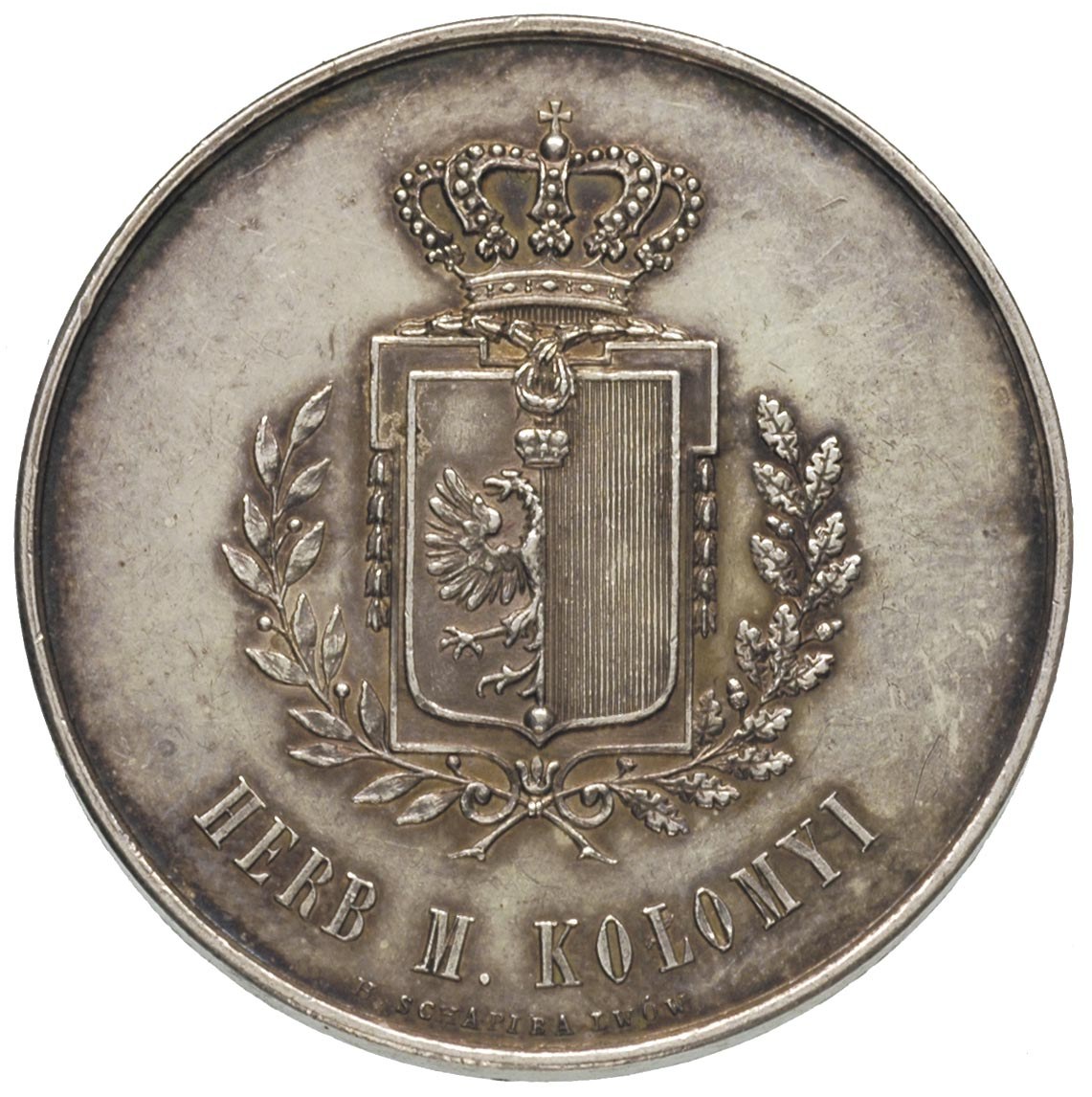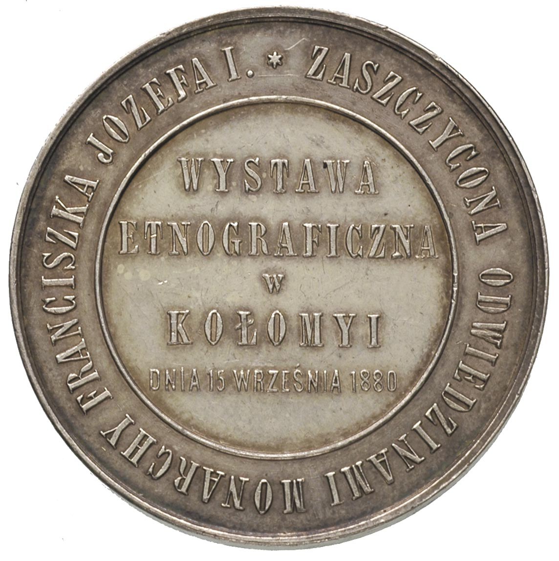 POLSKA, medal z Wystawy Etnograficznej w Kołomyi w 1880 r., Aw: Napisy w poziomie i w otoku, Rw: Herb i napis HERB M. KOŁOMYI, poniżej H. Schapira Lwów, srebro 14.78 g, 35 mm