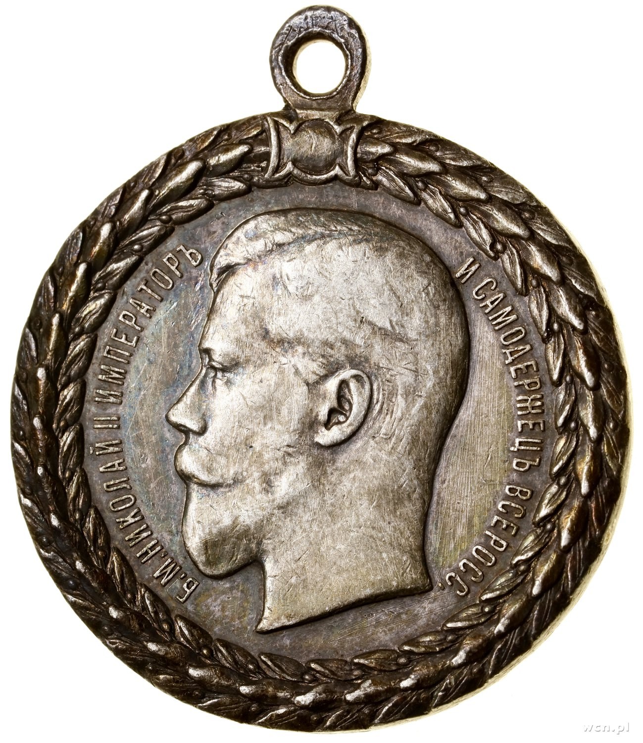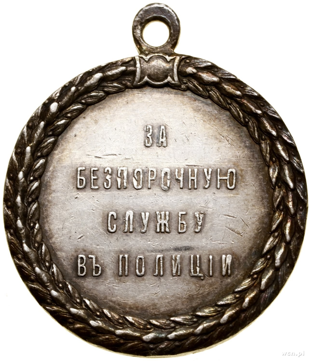 Mikołaj II (1894–1917), Medal za Wzorową Służbę w Policji, bez daty (od 1894); Wieniec, w którym głowa Mikołaja II w lewo i napis Б. М. НИКОЛАЙ II ИМПЕРАТОРЪ - И САМОДЕРЖЕЦЪ ВСЕРОСС., na stronie odwrotnej wieniec, w którym ЗА / БЕЗПОРОЧНУЮ / СЛУЖБУ / ВЪ ПОЛИЦІИ; Diakov 1145.1 (R1); srebro, 36.1 mm, 22.97 g; czyszczony.