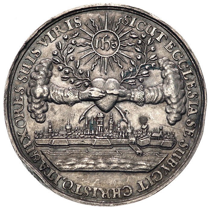 POLSKA, medal zaślubinowy autorstwa Jana Höhna seniora, Aw: Kobieta i mężczyzna w strojach hiszpańskich podają sobie dłonie, u góry Duch Święty i dwa aniołki, napis w otoku VIRI DILIGITE UXORES VESTRAS SICUT CHRIST DILEXIT ECCLES, Rw: Dwie ręce wychodzące z chmur trzymają wspólnie serce, poniżej widok Gdańska, napis w otoku SICUT ECCLESIA.., H-Cz.2352 (R1), Racz. 159a, srebro 49 mm, 29.07 g, uderzenie na rancie, patyna