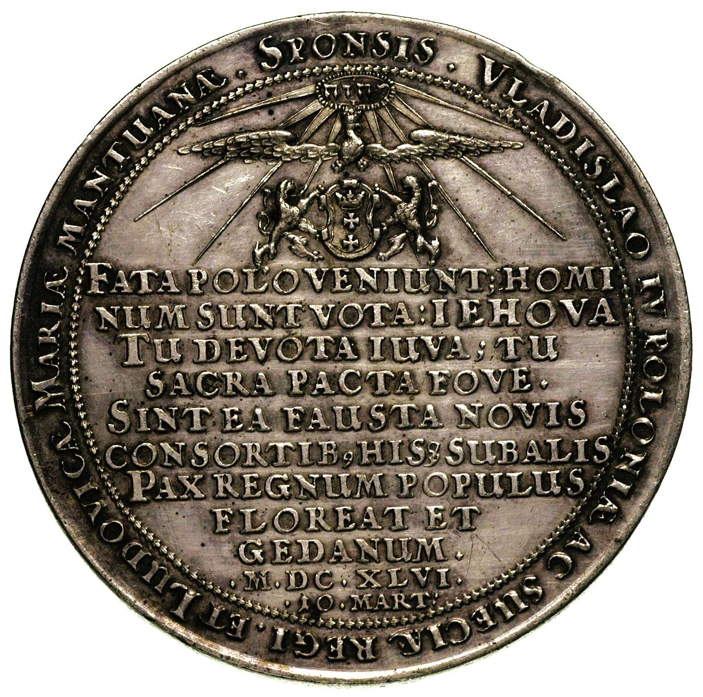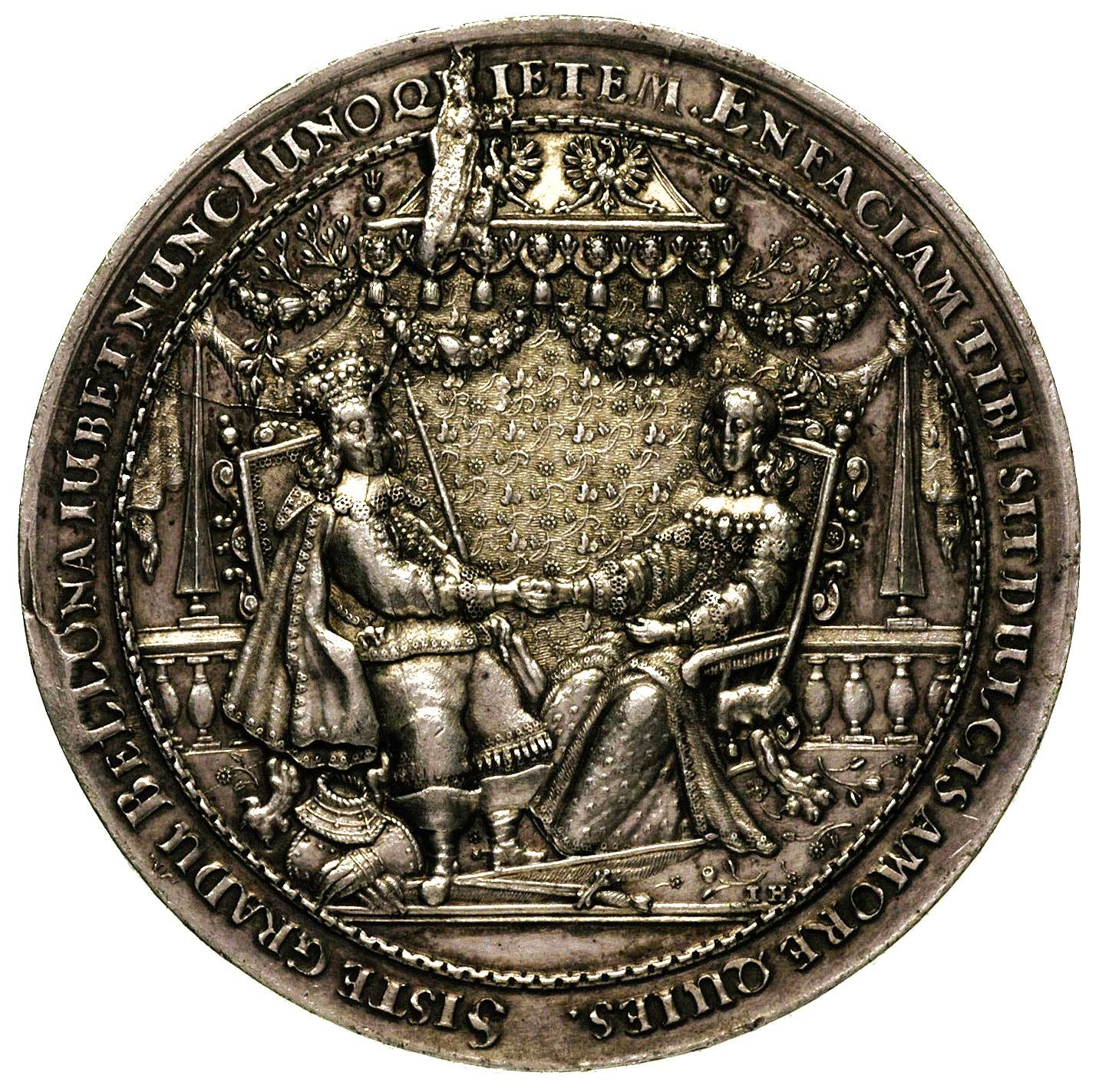 POLSKA, medal zaślubinowy Władysława IV z Marią Ludwiką Mantuańską 1646 r., Aw: Łoże królewskie, przed nim na krzesłach siedzą król i królowa, poniżej sygnatura I.H., w otoku napis SISTE GRADU BELLONA....., Rw: Orzeł nad herbem Gdańska, niżej napis FATA POLO VENIUNT...., w otoku napis VLADISLAO IV POLONIAE....., Racz. 125, H-Cz.1859 R4, srebro 57 mm, 71.61 g, na awersie widoczne ślady pęknięcia stempla, wyśmienity barokowy medal autorstwa Jana Höhna w bardzo dobrym stanie zachowania