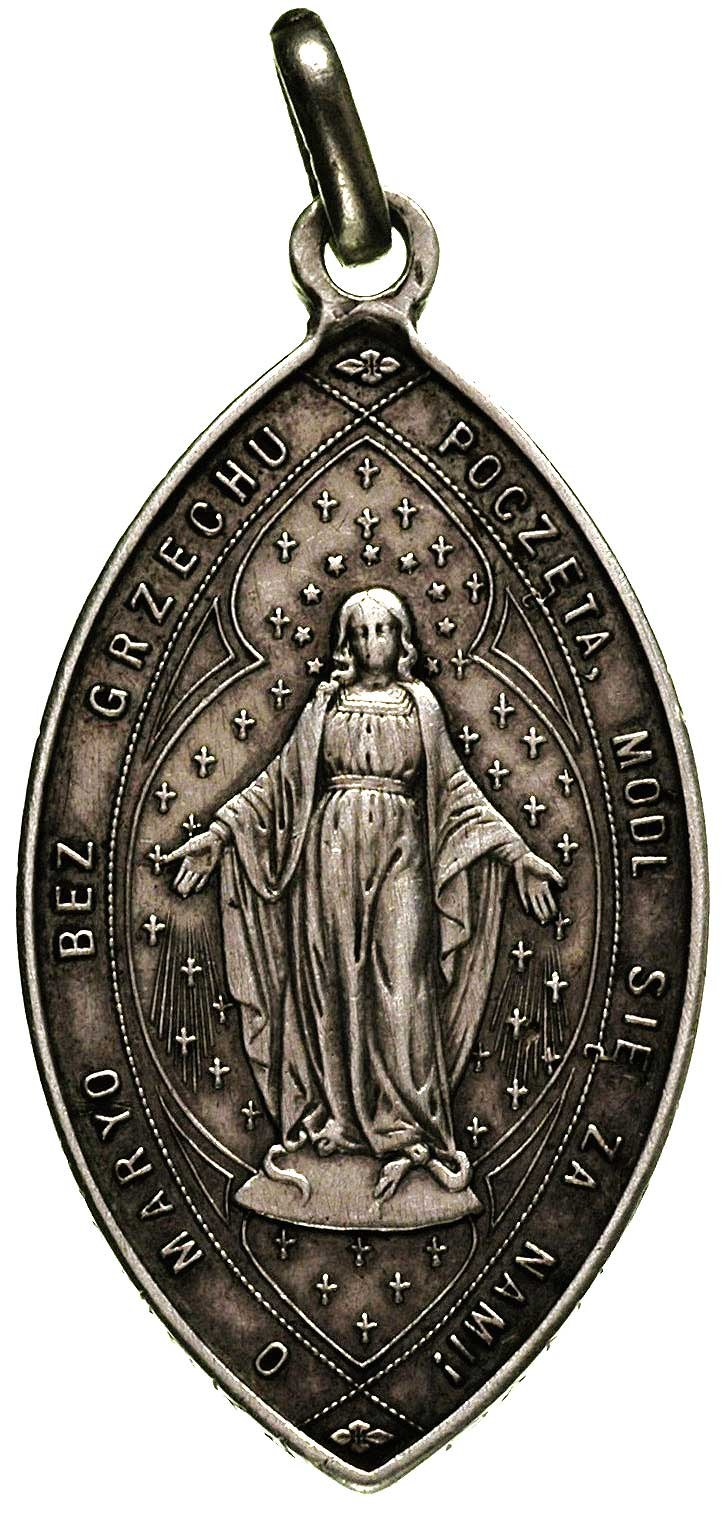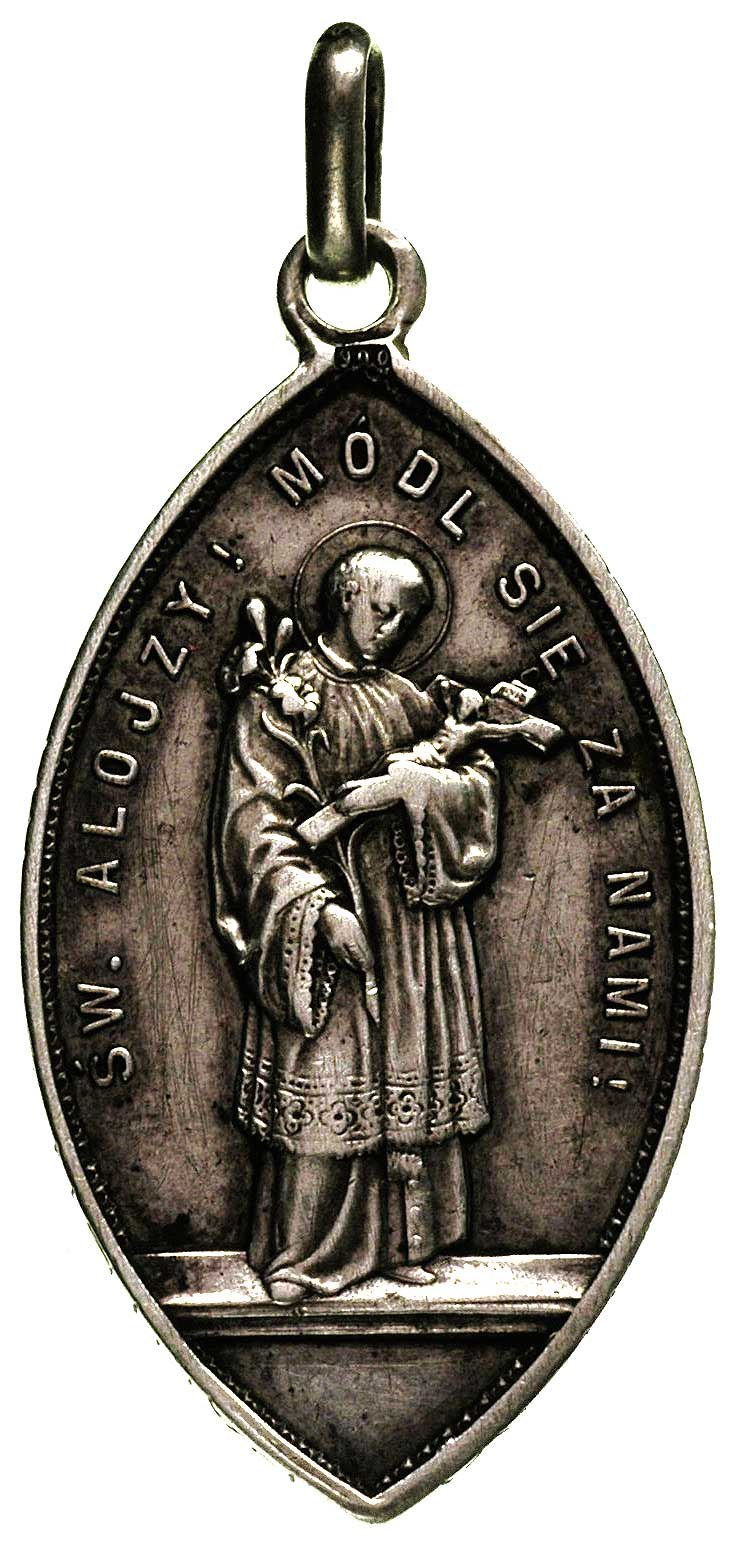 POLSKA, medalik religijny z uszkiem, Aw: Stojąca Matka Boska, w otoku napis O MARYO BEZ GRZECHU POCZĘTA, MÓDL SIĘ ZA NAMI, Rw: Postać świętego i napis ŚW. ALOJZY MÓDL SIĘ ZA NAMI, na rancie wygrawerowany napis KONGREGACJA MARIAŃSKA PANIEN CZERNIOWCE, srebro 38 x 22 mm