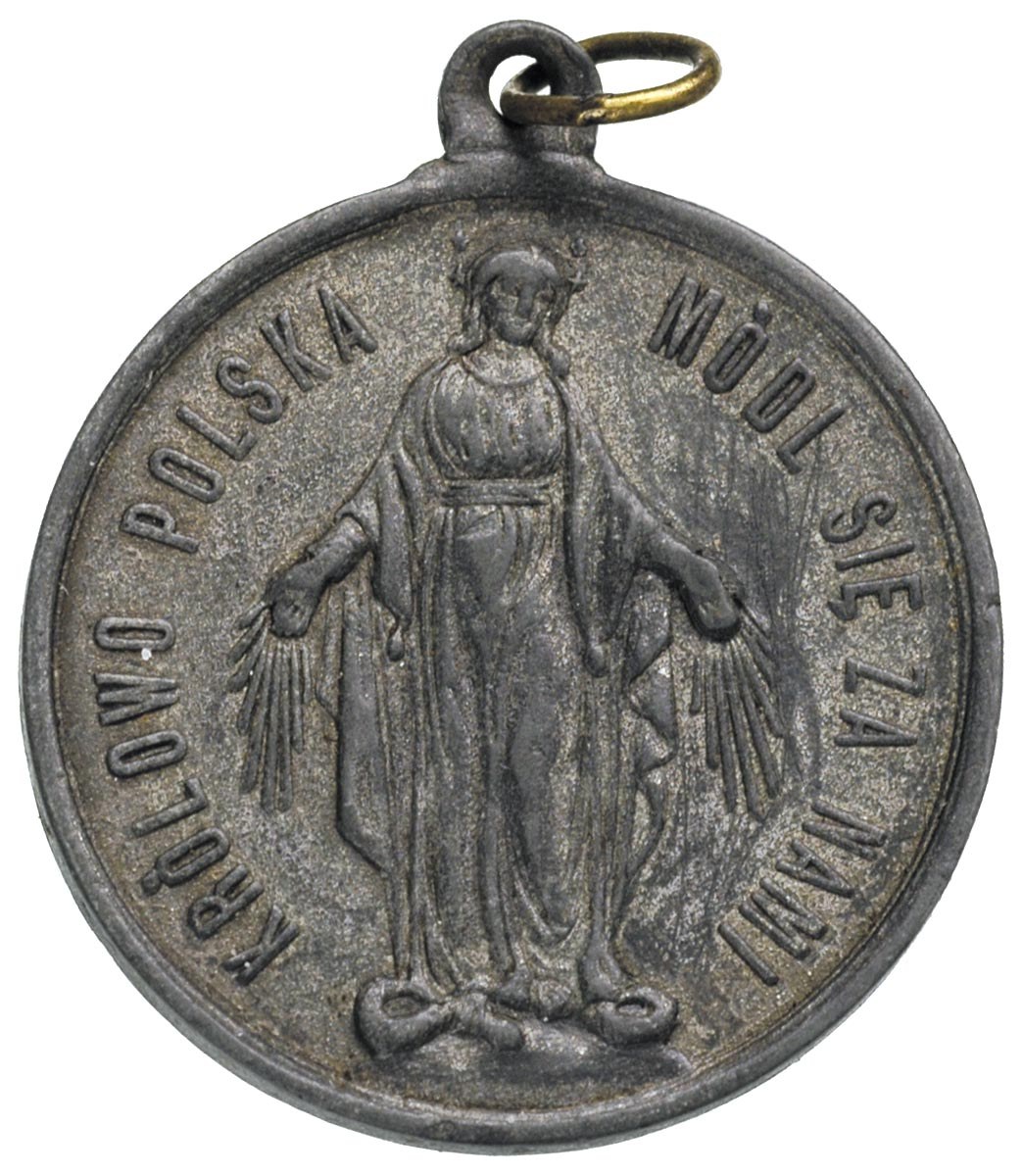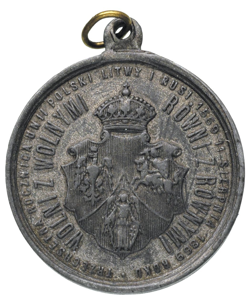 POLSKA, medalik z uszkiem na pamiątkę 300-letniej Rocznicy Unii Polski, Litwy i Rusi, Aw: Matka Boska depcząca węża i napis w otoku, Rw: Tarcza herbowa trójpolowa i napisy WOLNI Z WOLNYMI - RÓWNI Z RÓWNYMI, TRZECHSETNA ROCZNICA UNII POLSKI LITWY I RUSI 1569 11 SIERPNIA 1869 ROKU, cynk 32 mm, Rewoliński 1427 R2