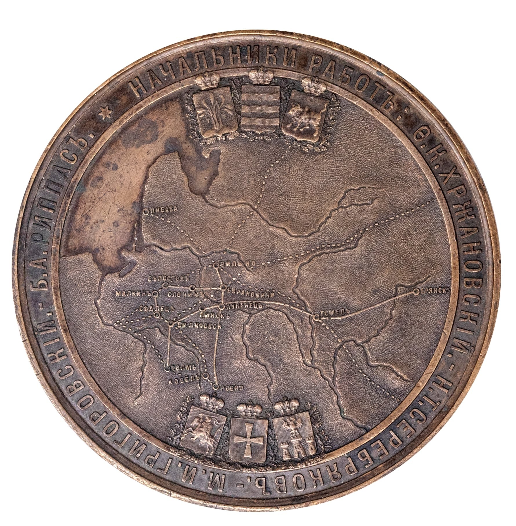 Reverse – Rusijos imperijos vakarinės dalies žemėlapis, geležinkelių tinklas, 6 gubernijų (įskaitant Vilniaus ir Kauno) herbai ir tekstas: „Начальники работ: Ф. К. Хржановский, Н. Т. Серебряков, М. И. Григоровский, Б. А. Риппас“.