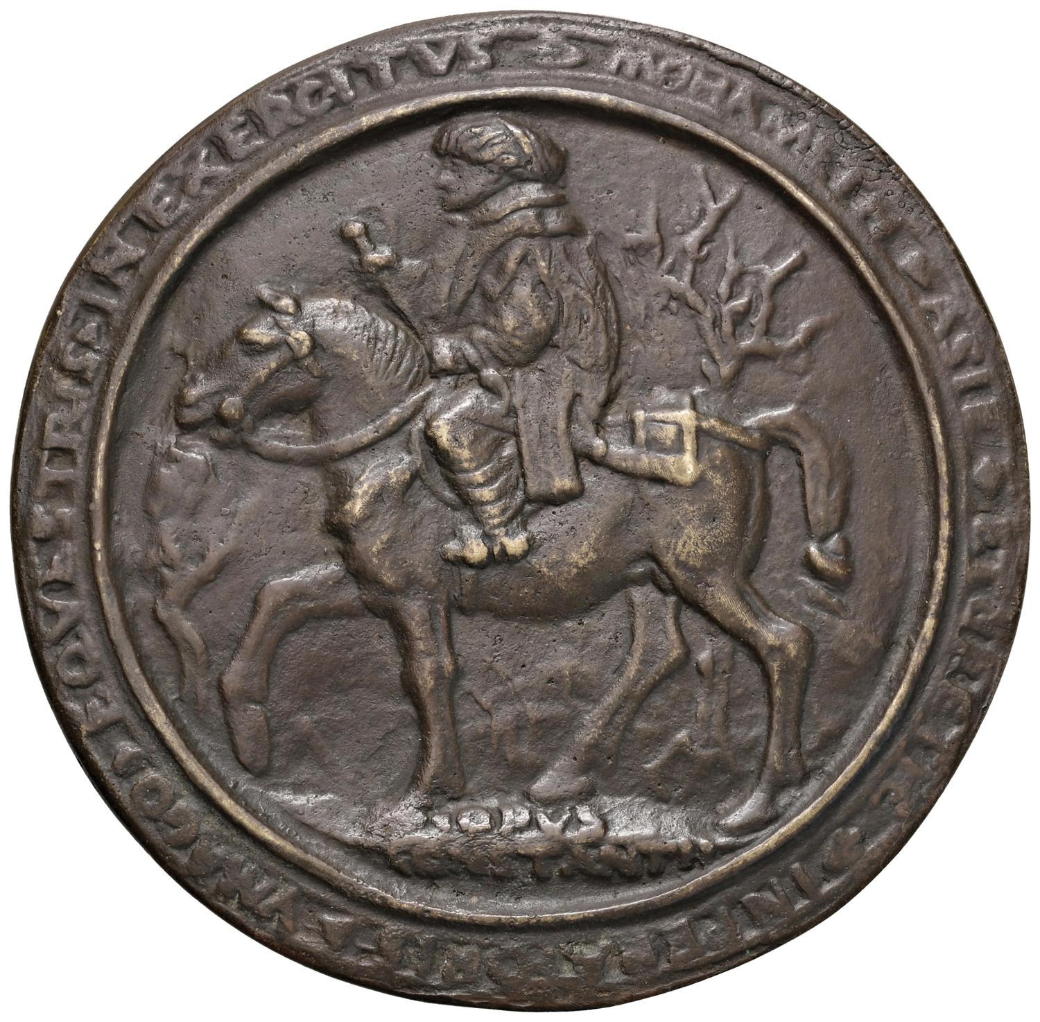 Mohammad II (Mehmed II) Sultano dell'Impero Ottomano (1451-1481) Medaglia - Busto con turbante a s. - R/ Il Sultano a cavallo - Opus: Costanzo da Ferrara - Armand I, p. 78, n°1 (Ø 121 mm); Hill, Corpus I, p. 80, n°322 AE (476 g - Ø 114 mm) AE Splendida fusione posteriore di questa rarissima medaglia