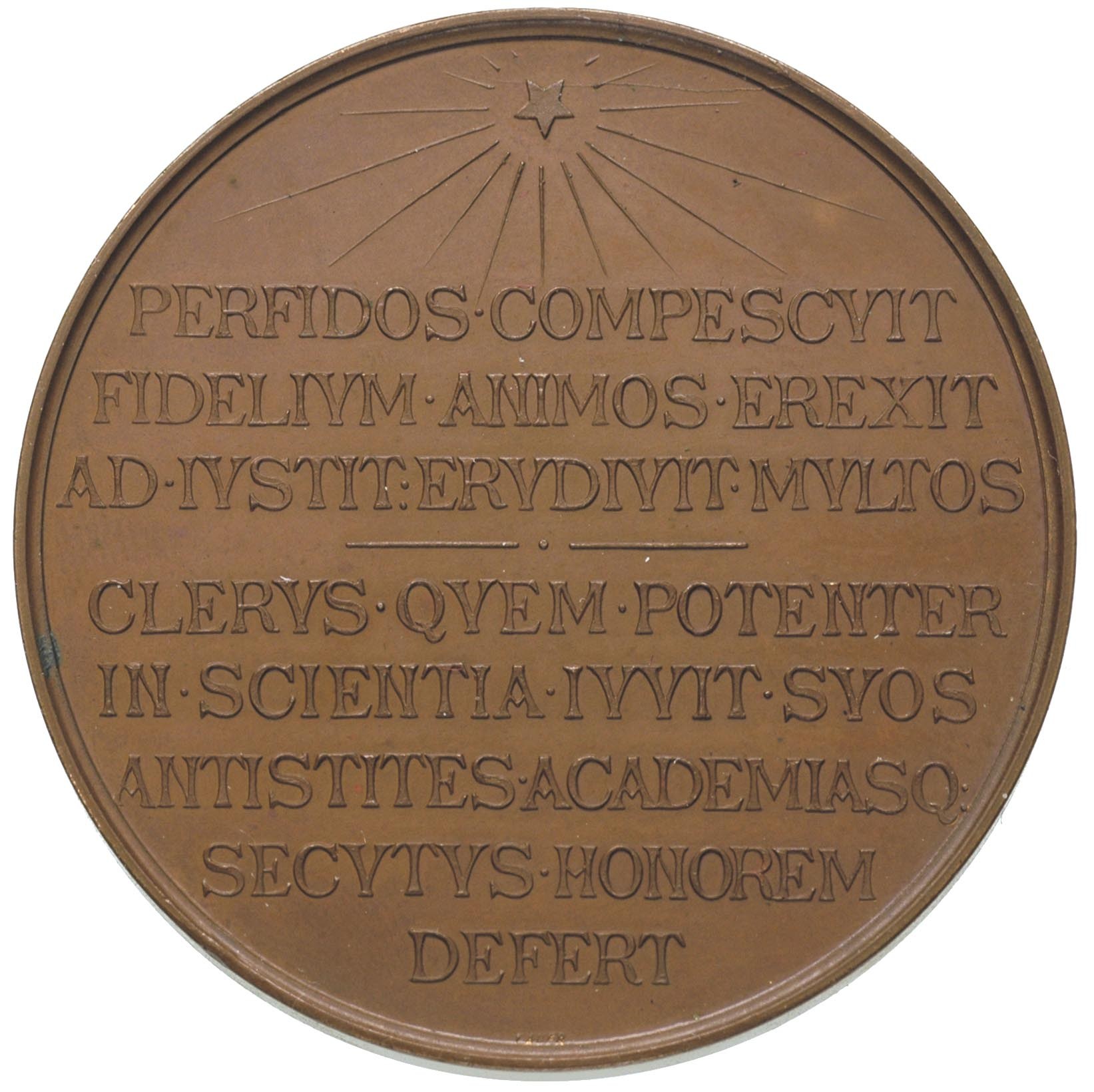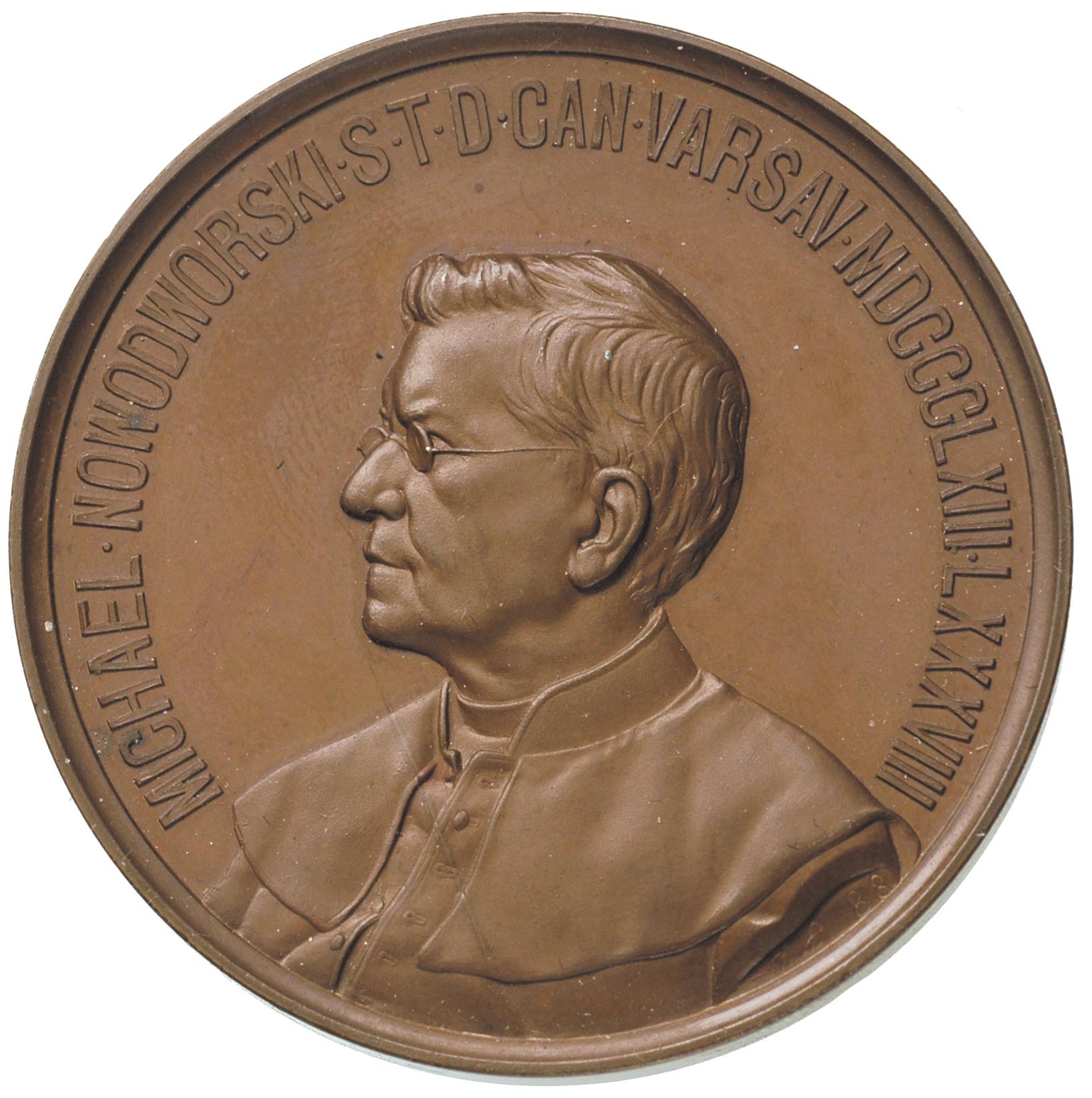 POLSKA, Michał Nowodworski- medal pamiątkowy 1888 r., Aw: Popiersie w lewo i napis w otoku MICHAEL NOWODWORSKI S.T.CAN. VARSAV.MDCCCLXIII-LXXX VIII, na ramieniu Ł 88 (Ignacy Łopieński), Rw: Napis poziomy PERFIDOS.COMPESCVIT....., brąz 49.96 g, 50.3 mm