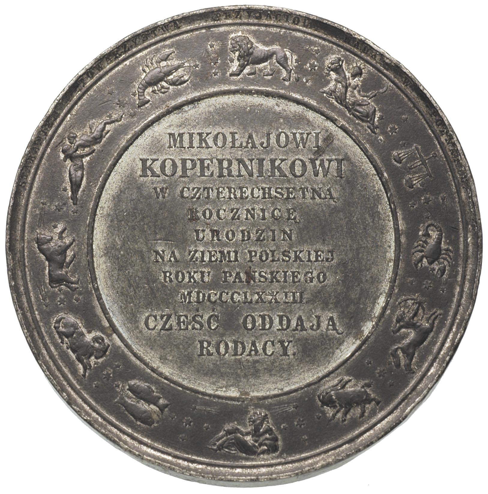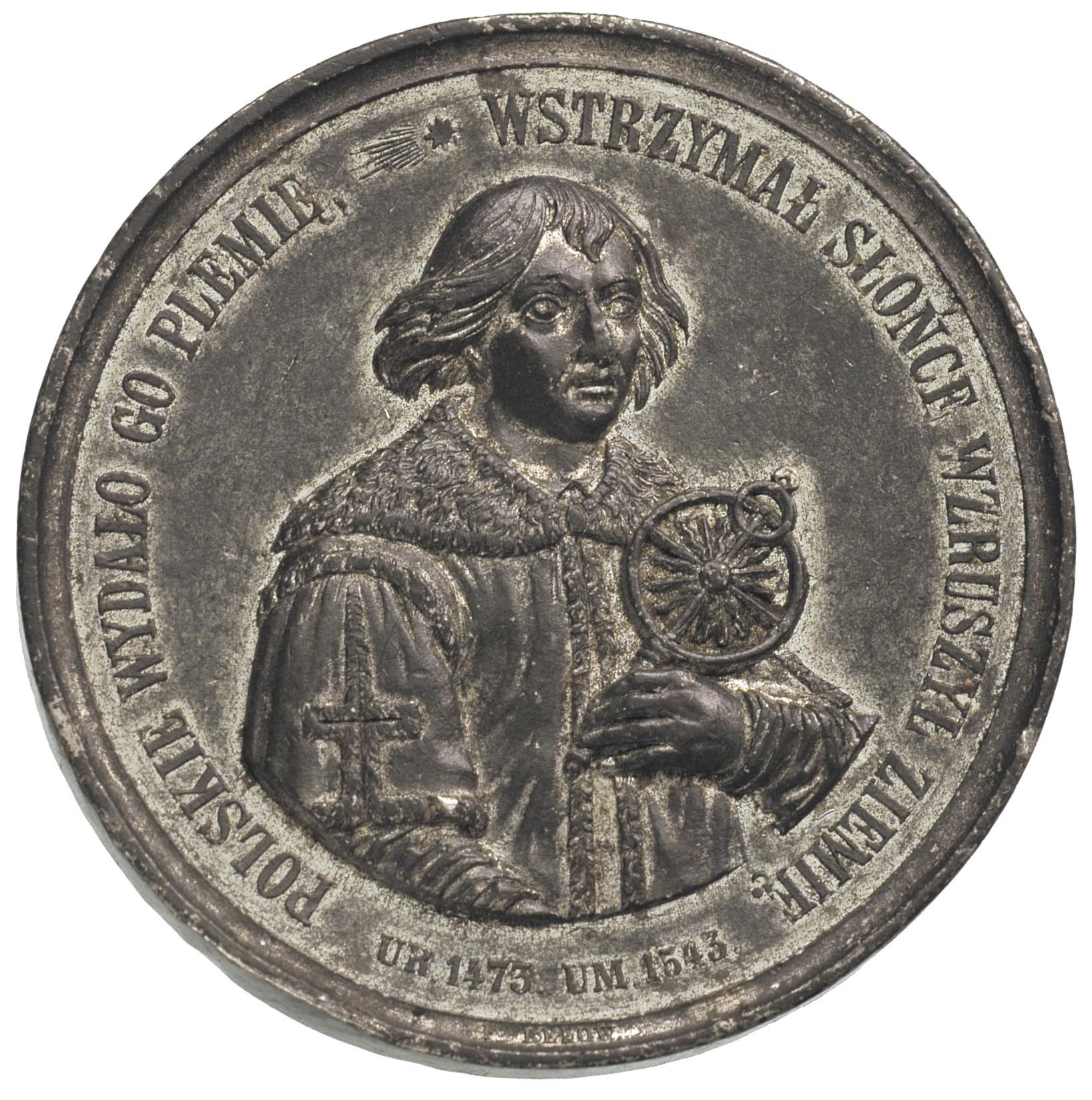 POLSKA, Mikołaj Kopernik - medal na 400-lecie urodzin, 1873 r., Aw: Popiersie astronoma trzyczwarte w prawo, w otoku napis WSTRZYMAŁ SŁOŃCE WZRUSZYŁ ZIEMIĘ POLSKIE WYDAŁO GO PLEMIĘ, poniżej daty ur.1473 - um.1543, na dole przy krawędzi sygn. F.BELOW, Rw: Poziomy napis MIKOŁAJOWI KOPERNIKOWI W CZTERECHSETNĄ ROCZNICE URODZIN NA ZIEMI POLSKIEJ ROKU PAŃSKIEGO MDCCCLXXIII CZEŚĆ ODDAJĄ RODACY, w otoku znaki zodiaku, na górze przy krawędzi STARANIEM TOWARZYSTWA PRZYJACIÓŁ NAUK W POZNANIU, cynk 64 mm, H-Cz. 8061